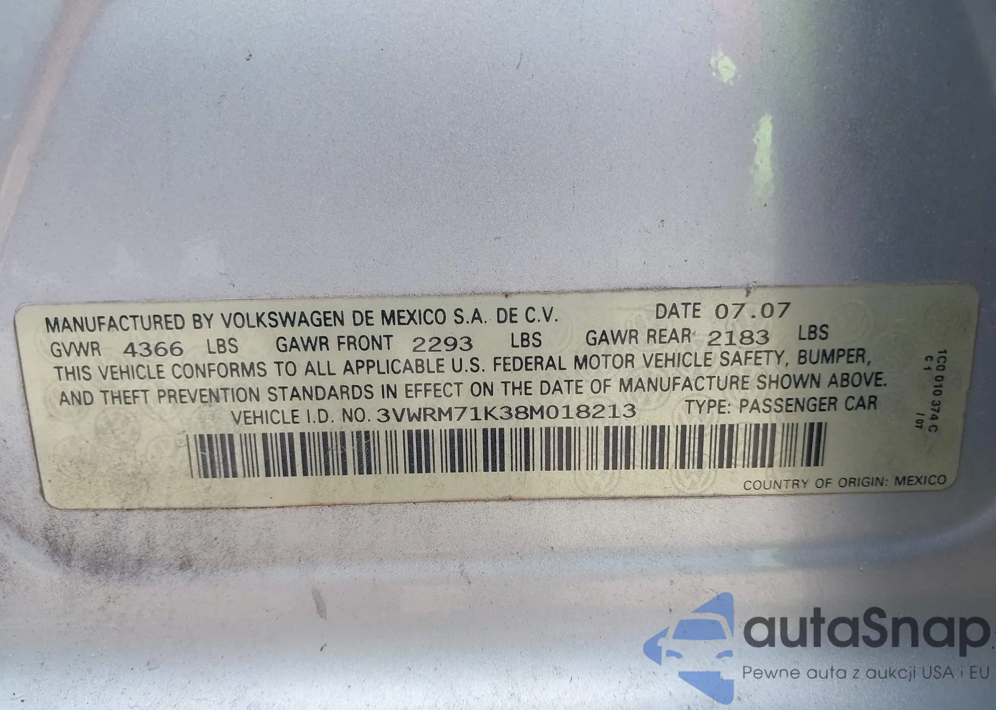 • VIN 3VWRM71K38M018213