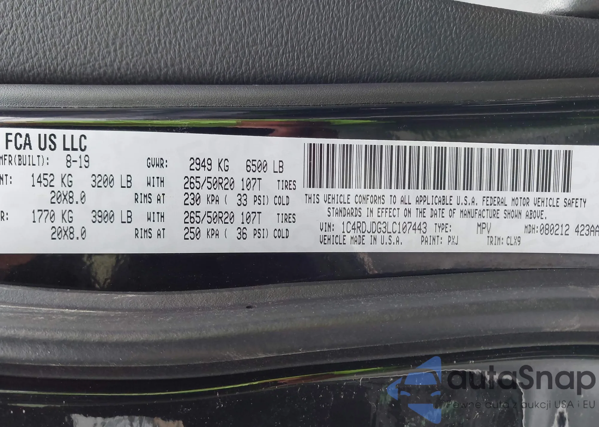 • VIN 1C4RDJDG3LC107443