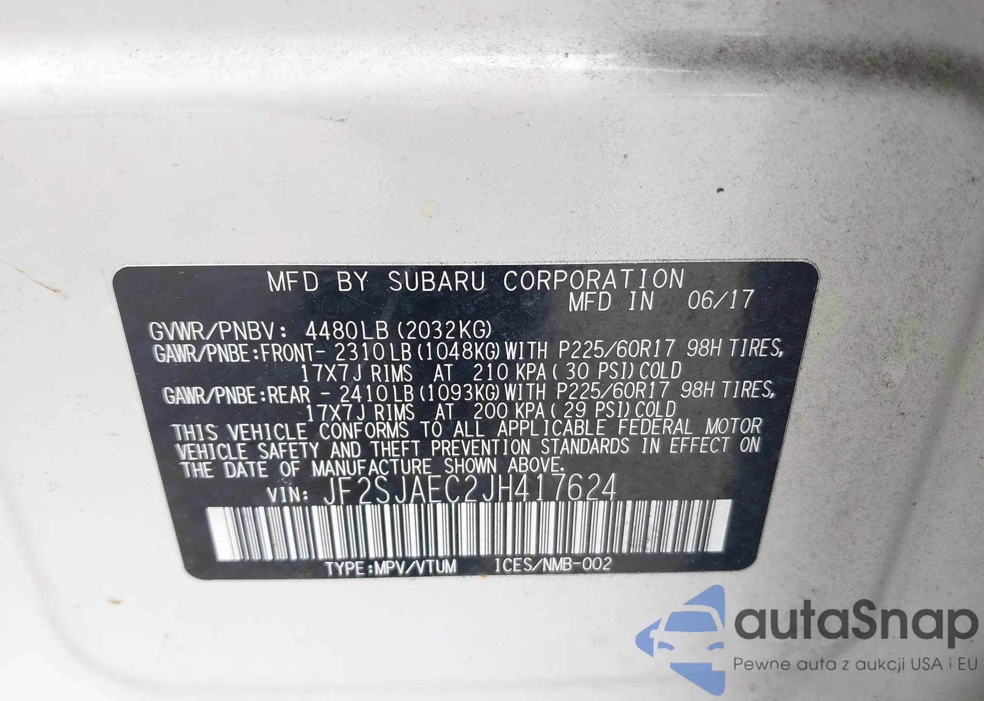 • VIN JF2SJAEC2JH417624