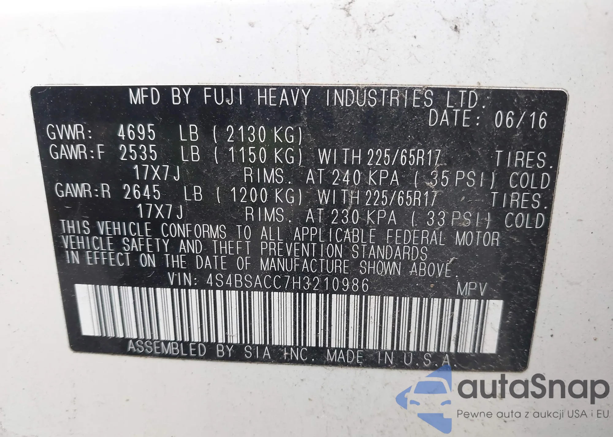 LOT: 42495906 VIN: 4S4BSACC7H3210986