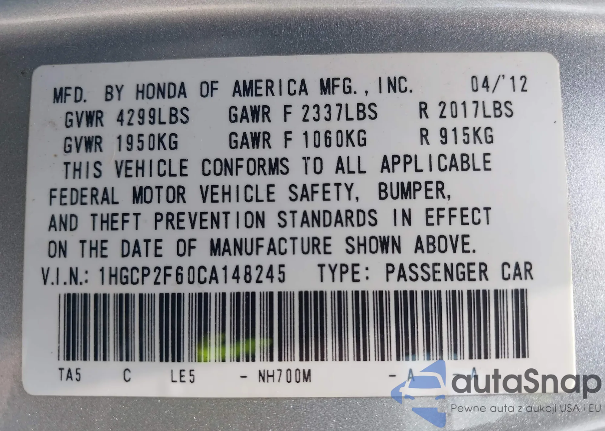 • VIN JHMFE1F74NX010338