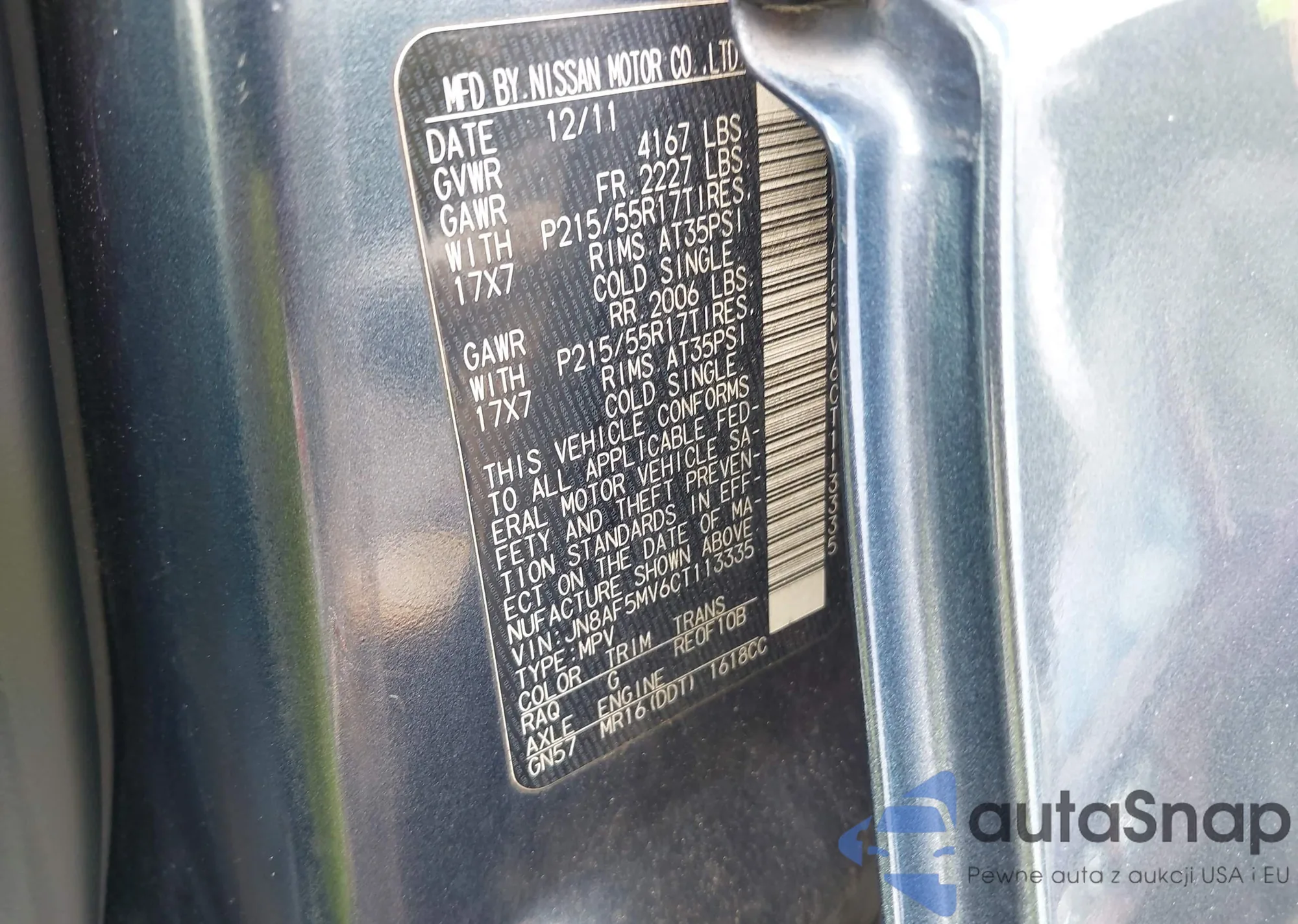 LOT: 42763102 VIN: JN8AF5MV6CT113335