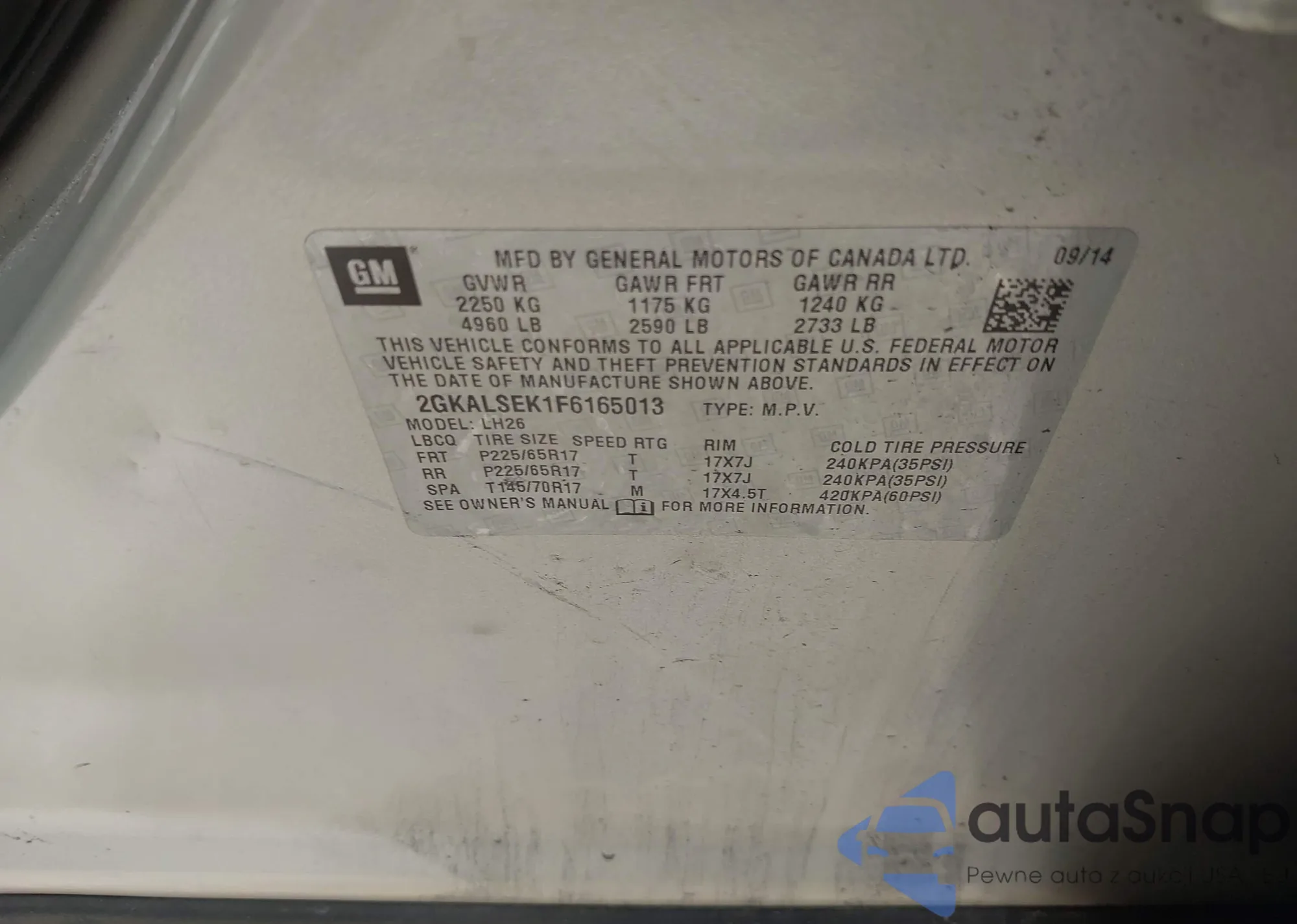 LOT: 41961929 VIN: 2GKALSEK1F6165013