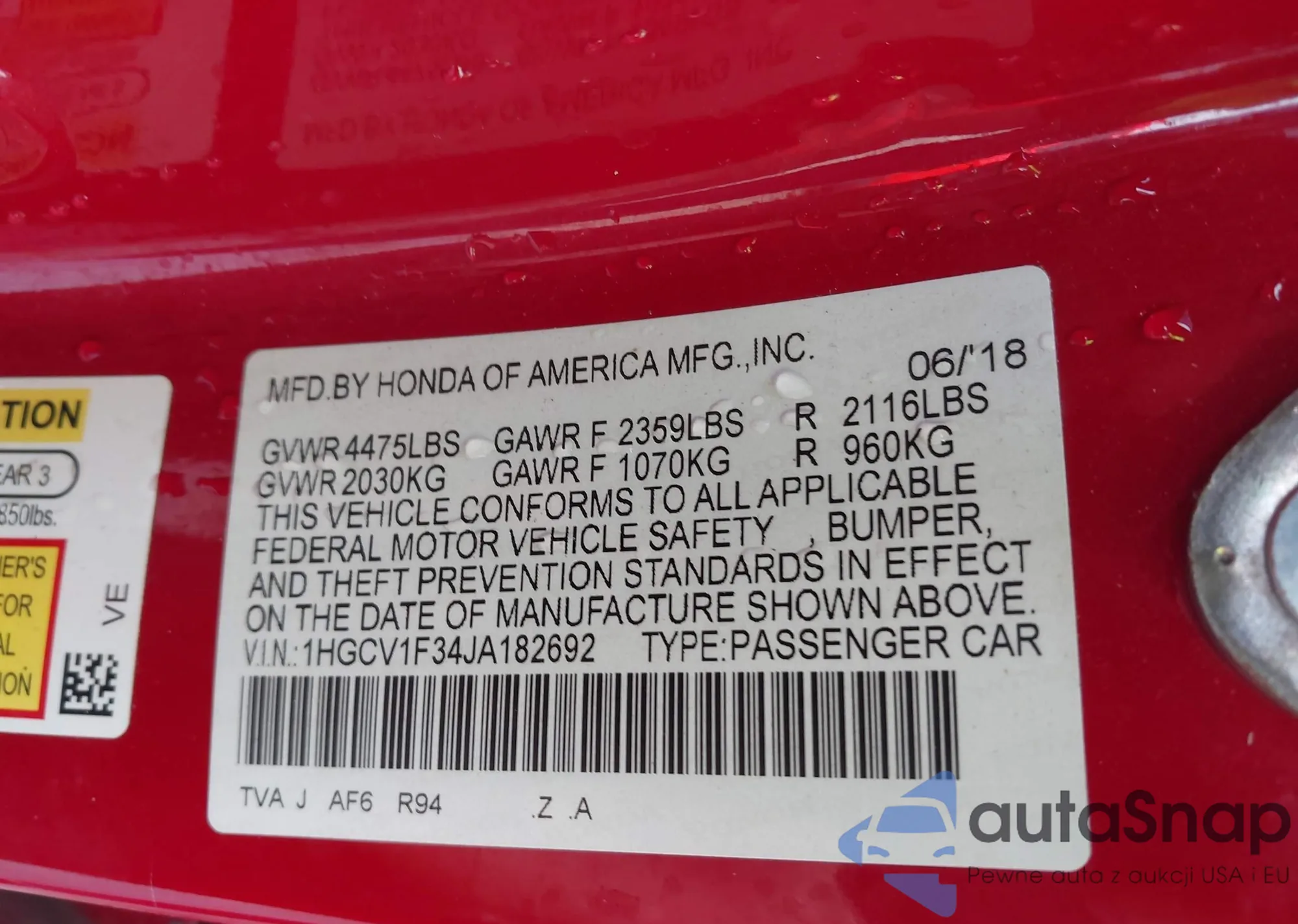 LOT: 41580134 VIN: 1HGCV1F34JA182692