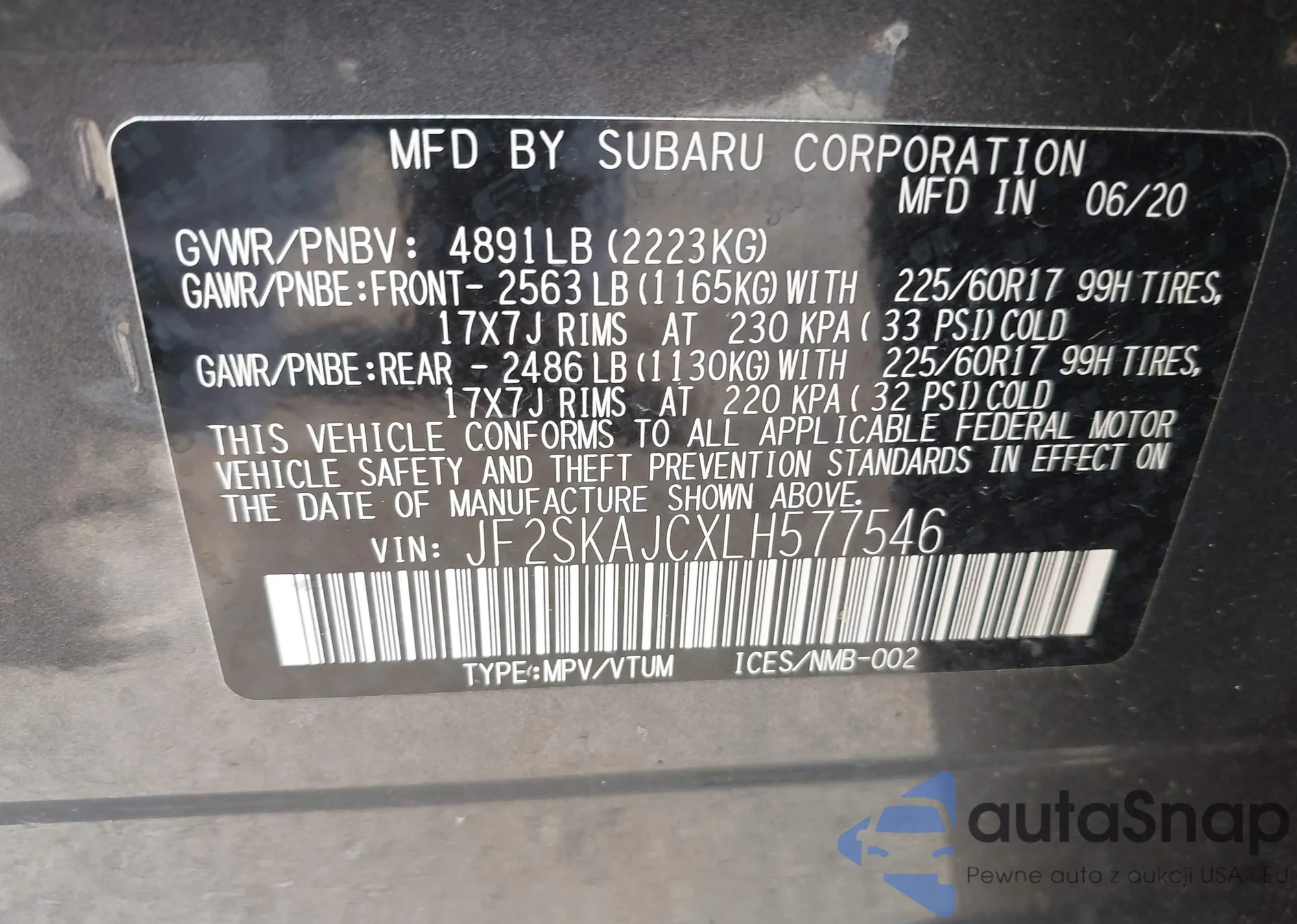 LOT: 42594599 VIN: JF2SKAJCXLH577546
