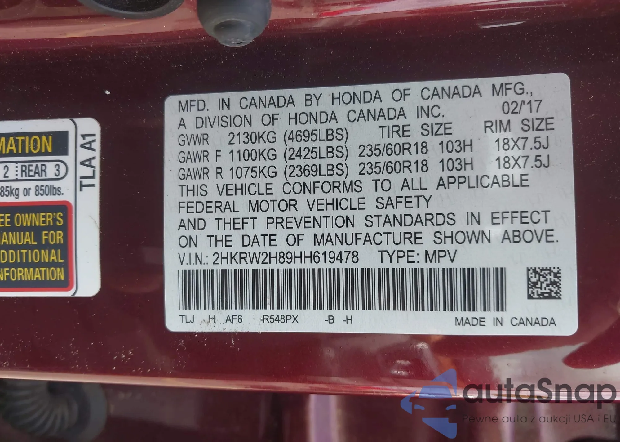 • VIN 2HKRW2H89HH619478