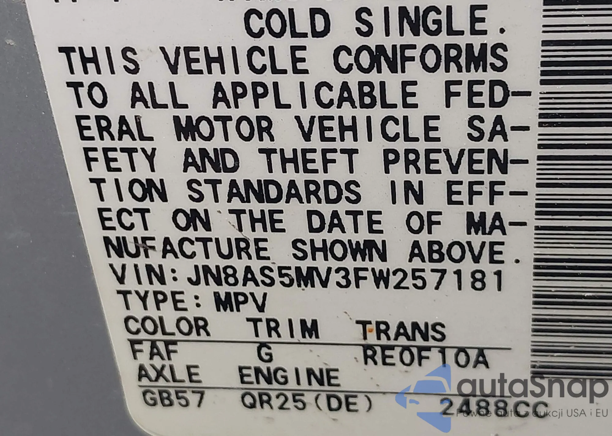 LOT: 42402574 VIN: JN1BV7AR9FM413720