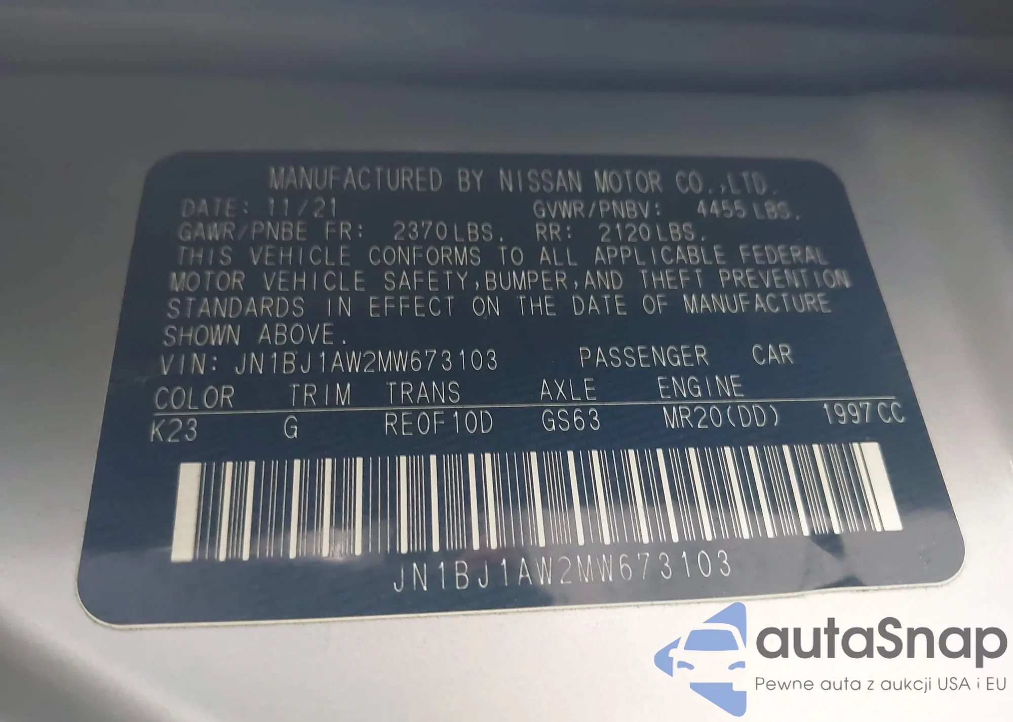 LOT: 42586374 VIN: JN1BJ1AW2MW673103