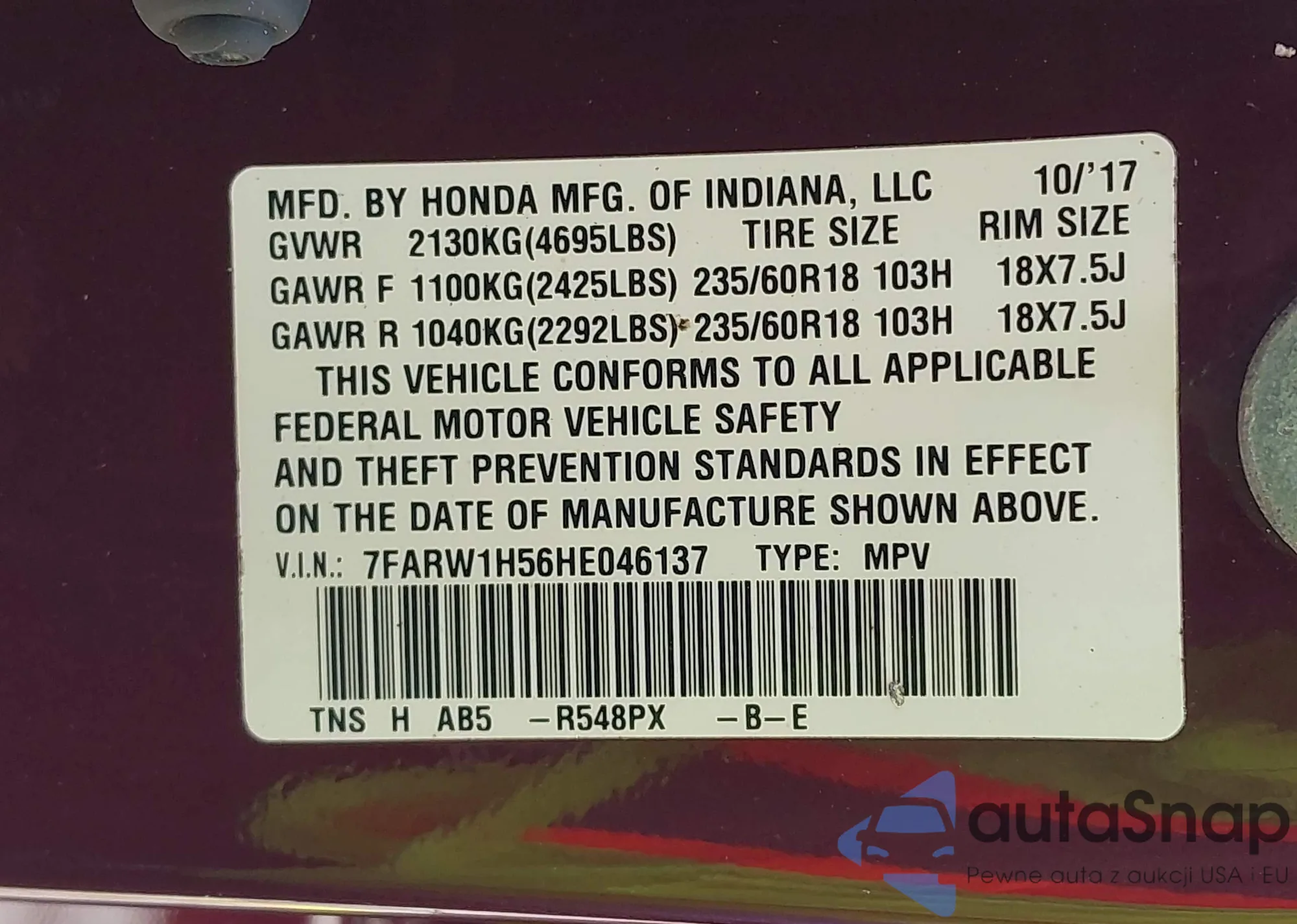 • VIN 7FARW1H56HE046137