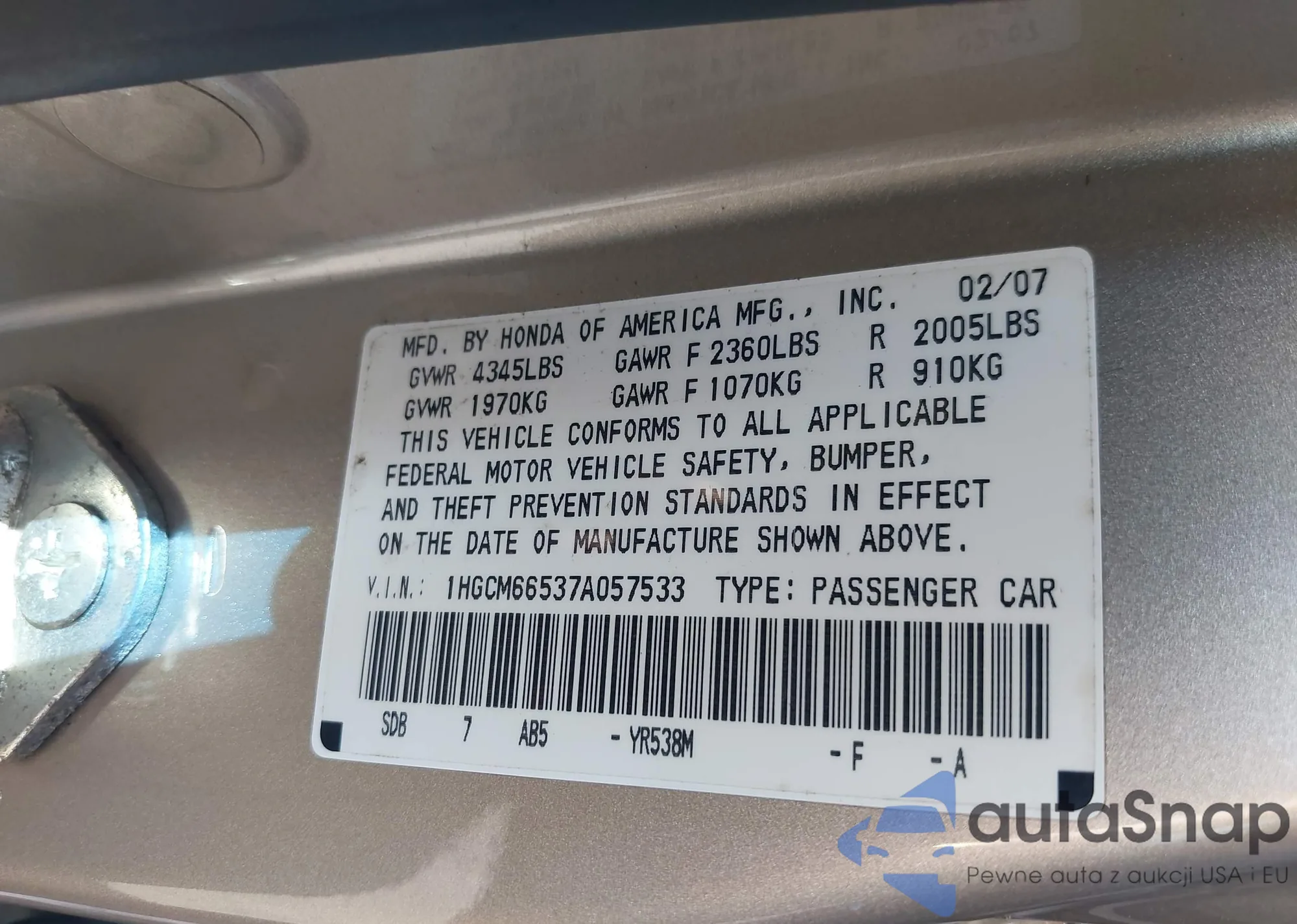LOT: 42611251 VIN: 1HGCM66537A057533