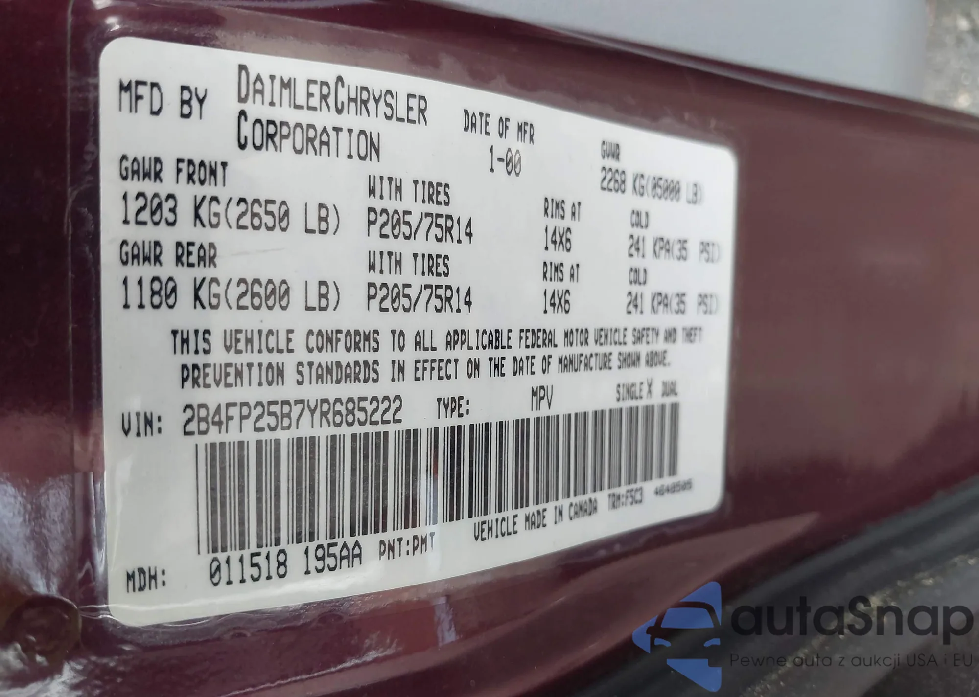 • VIN 2B4FP25B7YR685222