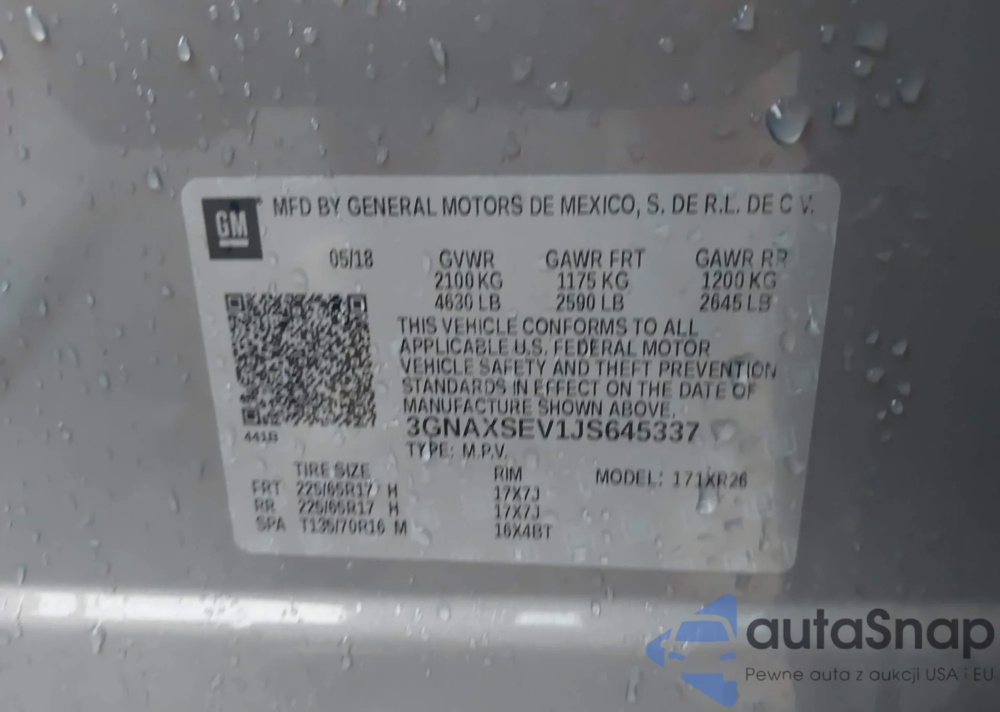 LOT: 42636886 VIN: 3GNAXSEV1JS645337