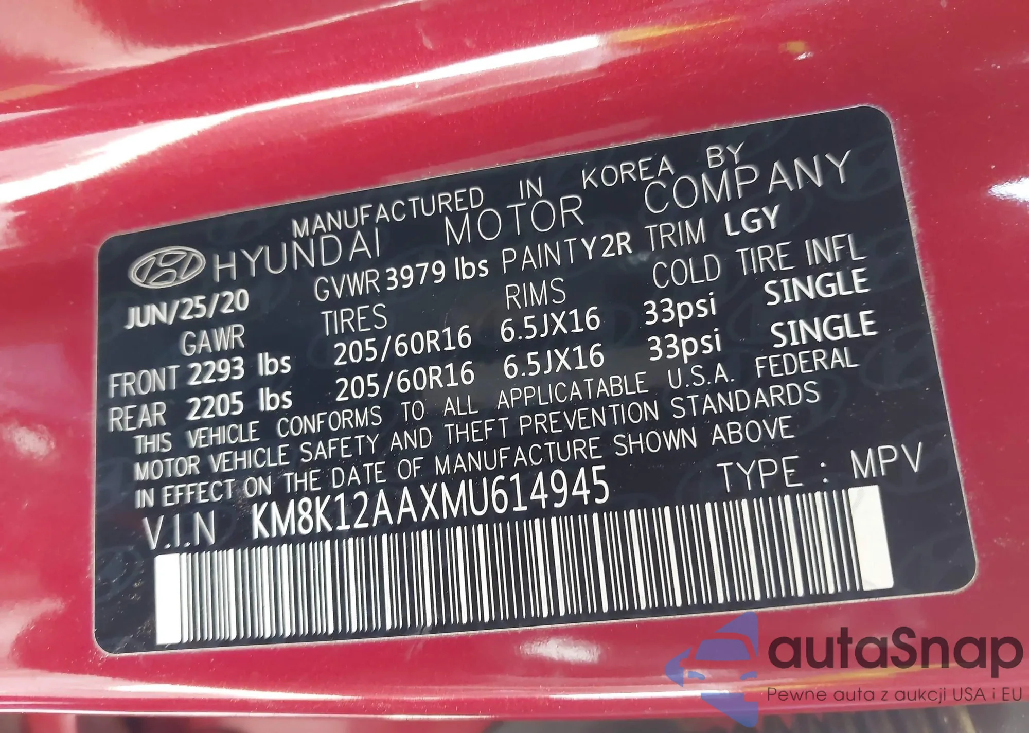 LOT: 41768863 VIN: KM8K12AAXMU614945