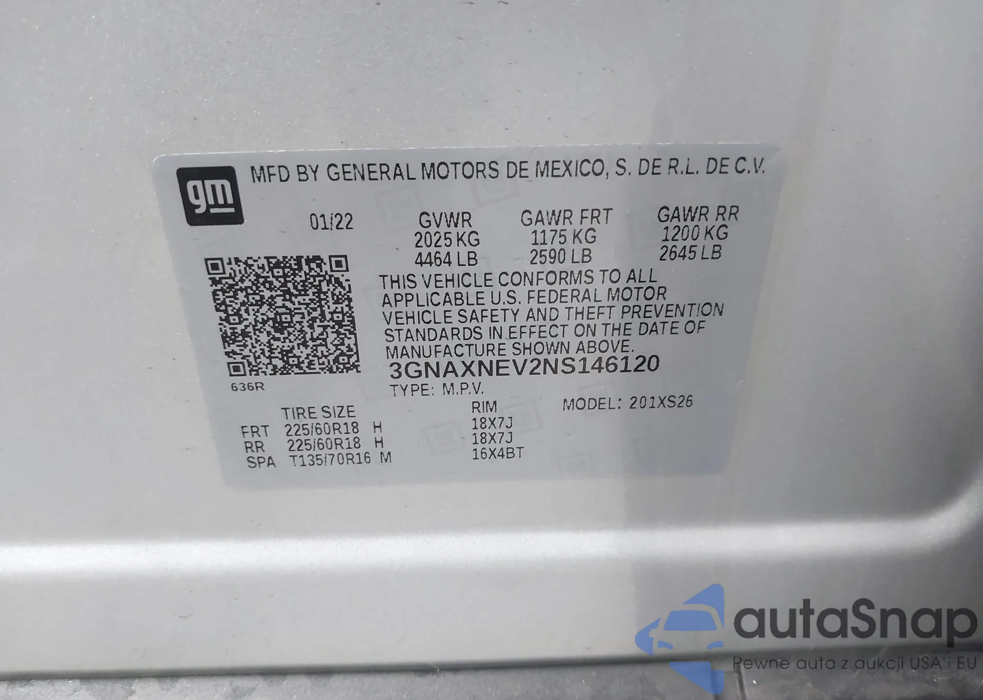 LOT: 42440093 VIN: 3GNAXNEV2NS146120
