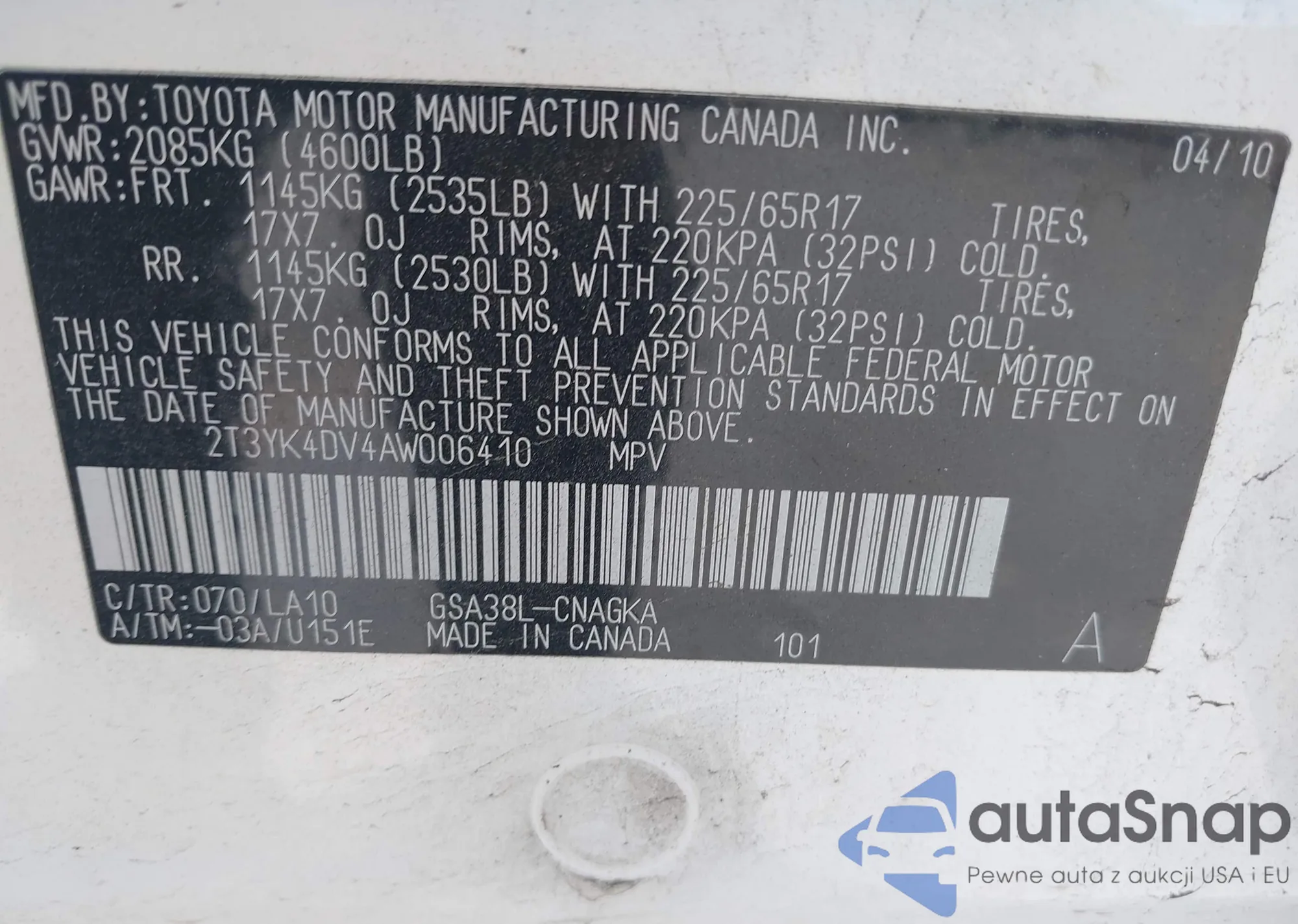 LOT: 42750406 VIN: 2T3YK4DV4AW006410