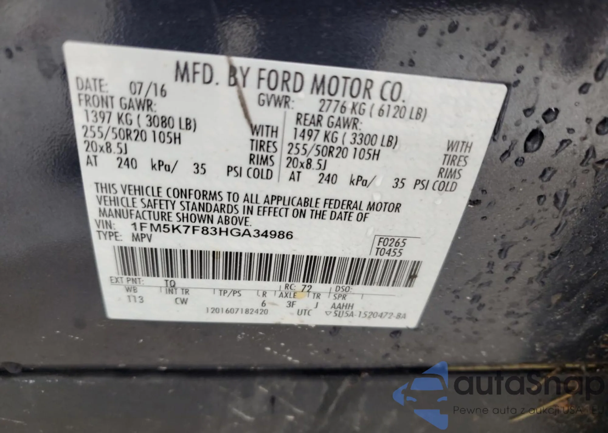LOT: 59550635 VIN: 1FM5K7F83HGA34986