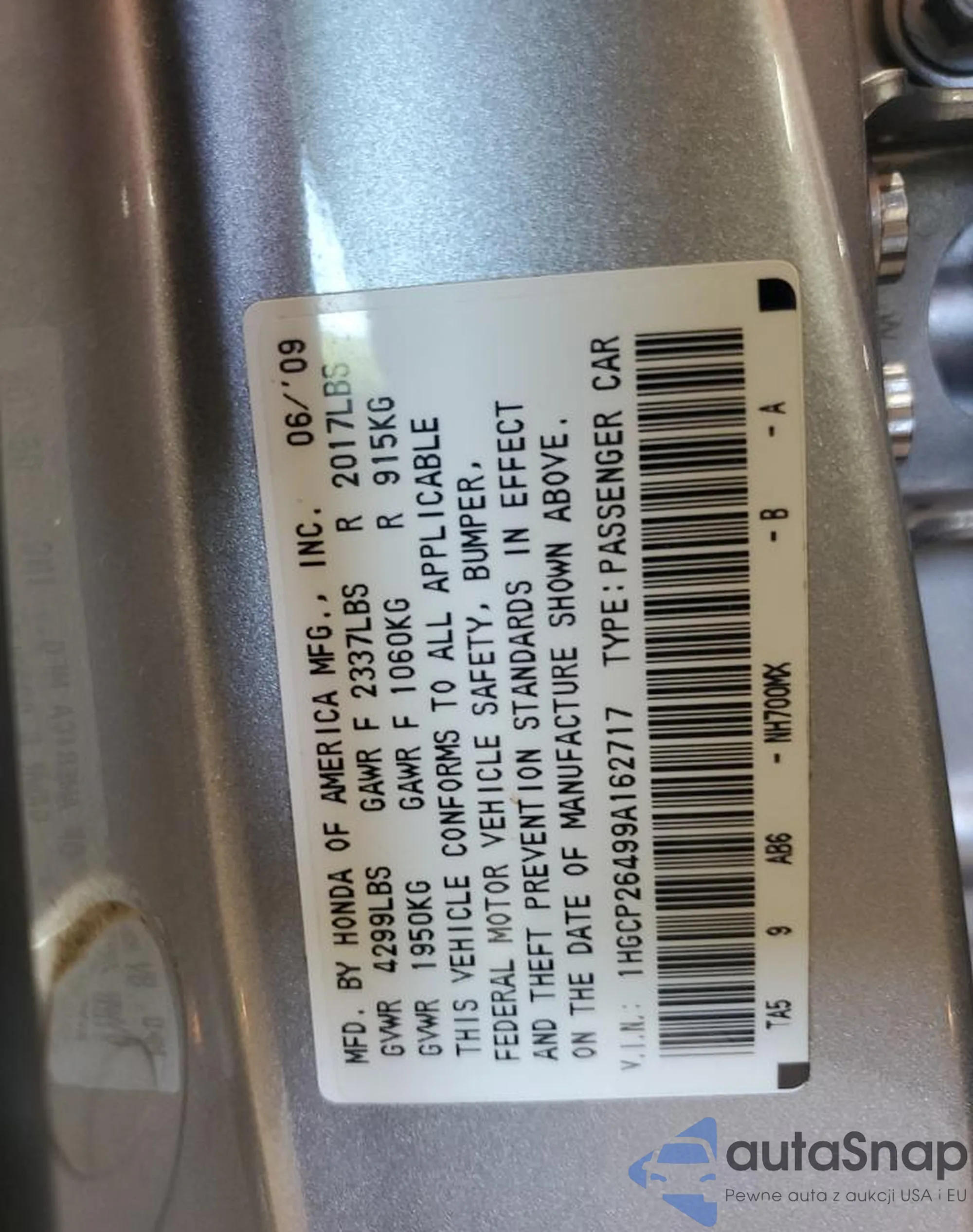 • VIN 1HGCP26499A162717
