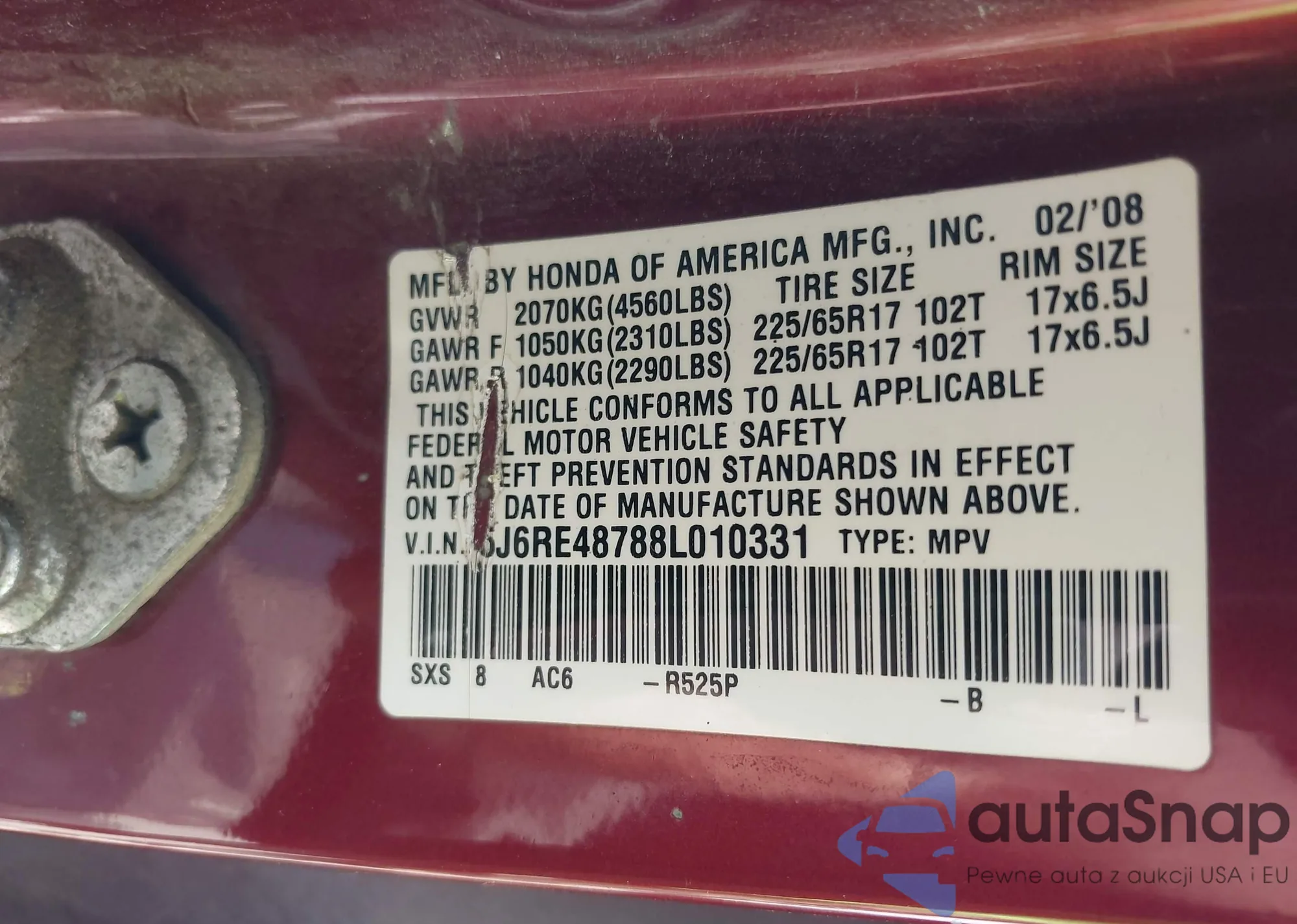 • VIN 5J6RE48788L010331