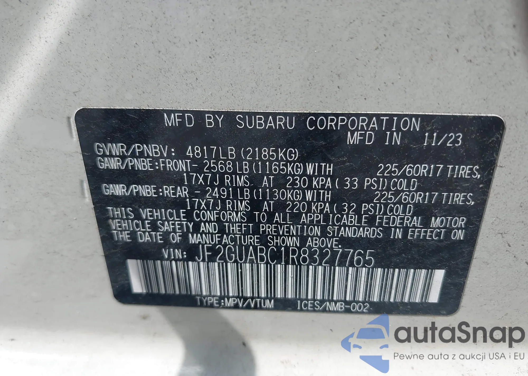 LOT: 42609608 VIN: JF2GUABC1R8327765
