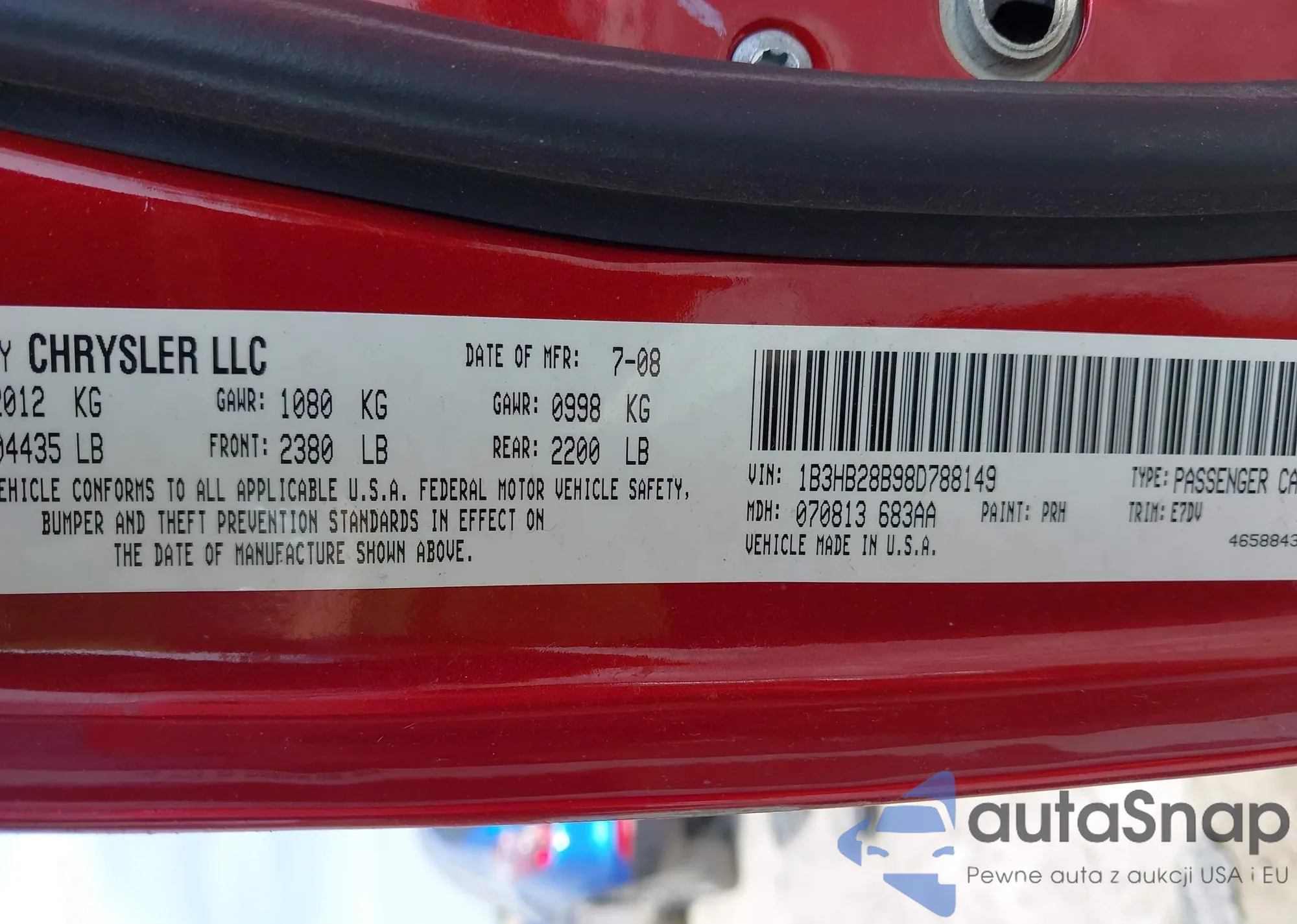 • VIN 1B3HB28B98D788149