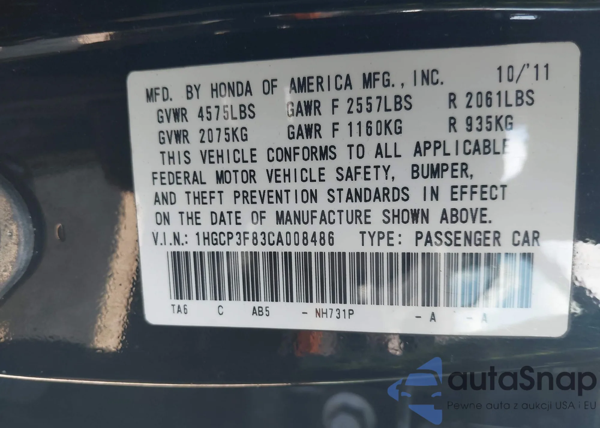 • VIN 1HGCP3F83CA008486