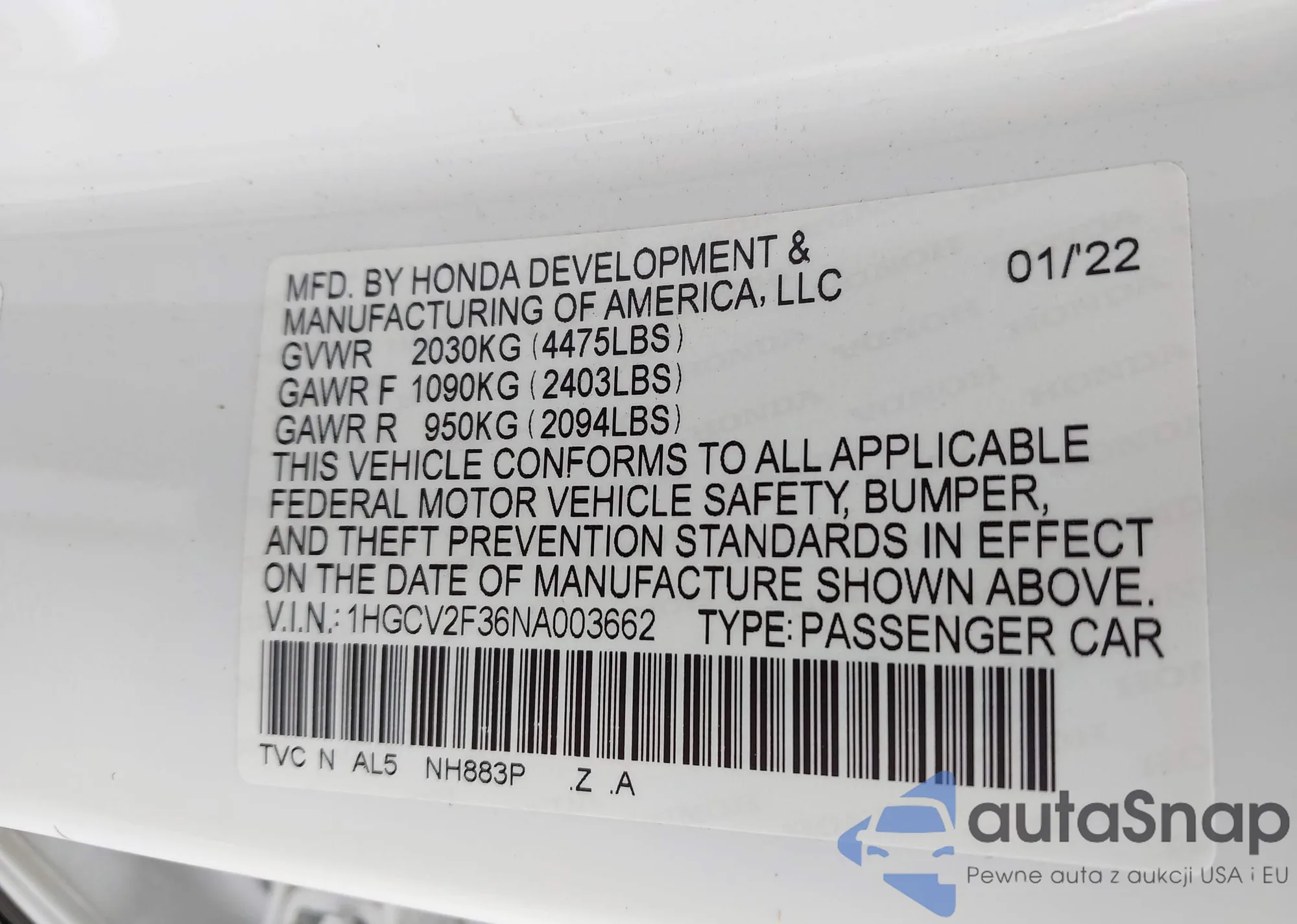 • VIN 1HGCV2F36NA003662