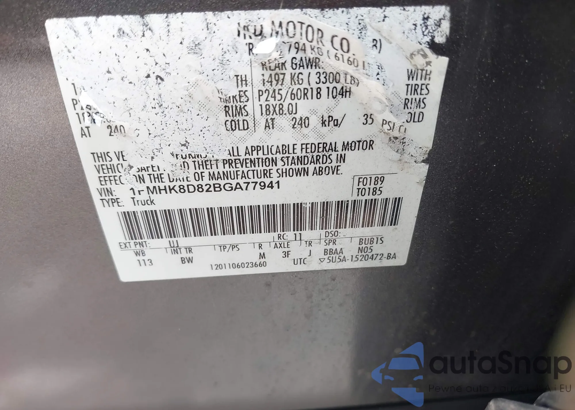 LOT: 42677489 VIN: 1FMHK8D82BGA77941