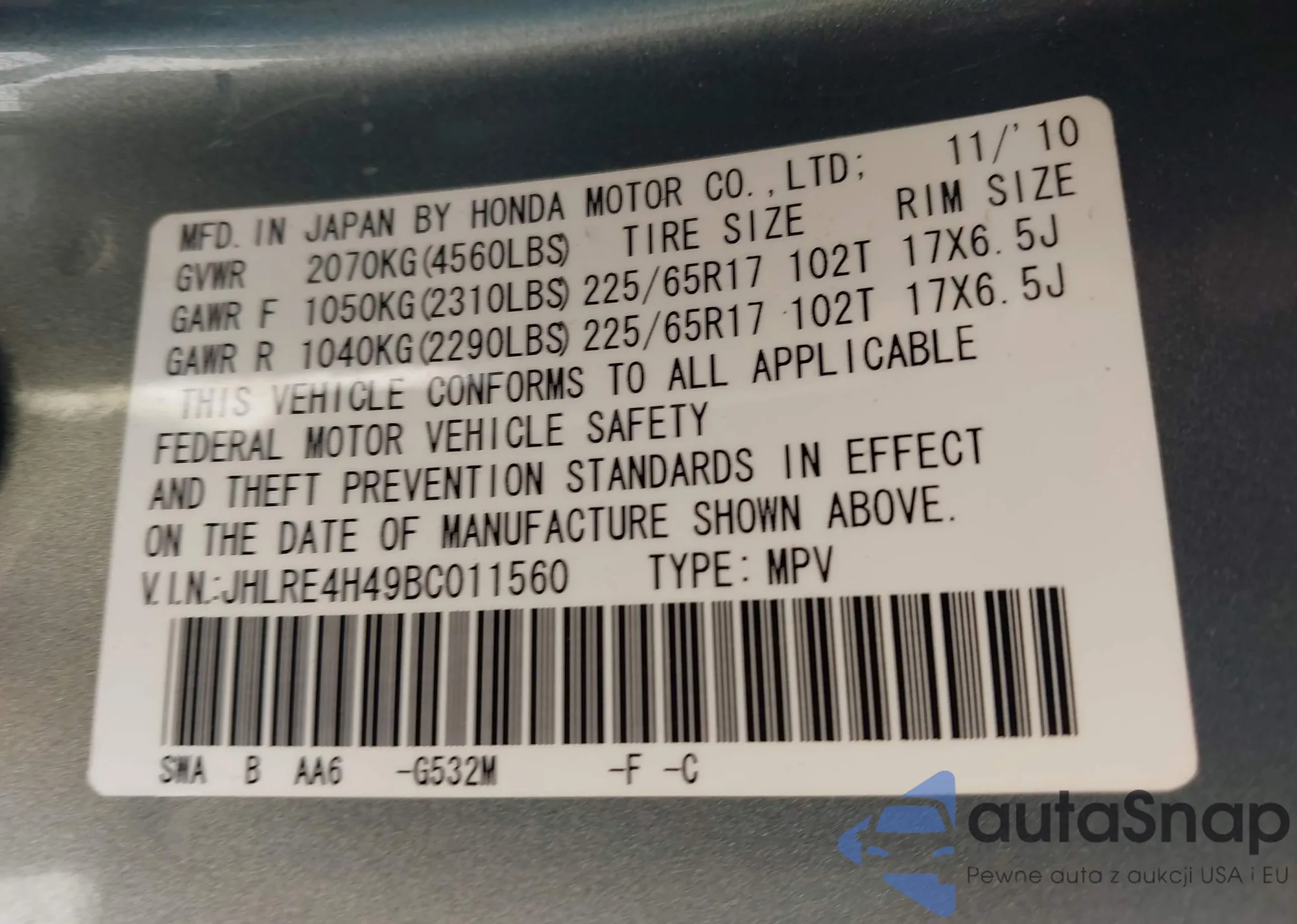 • VIN JHLRE4H49BC011560