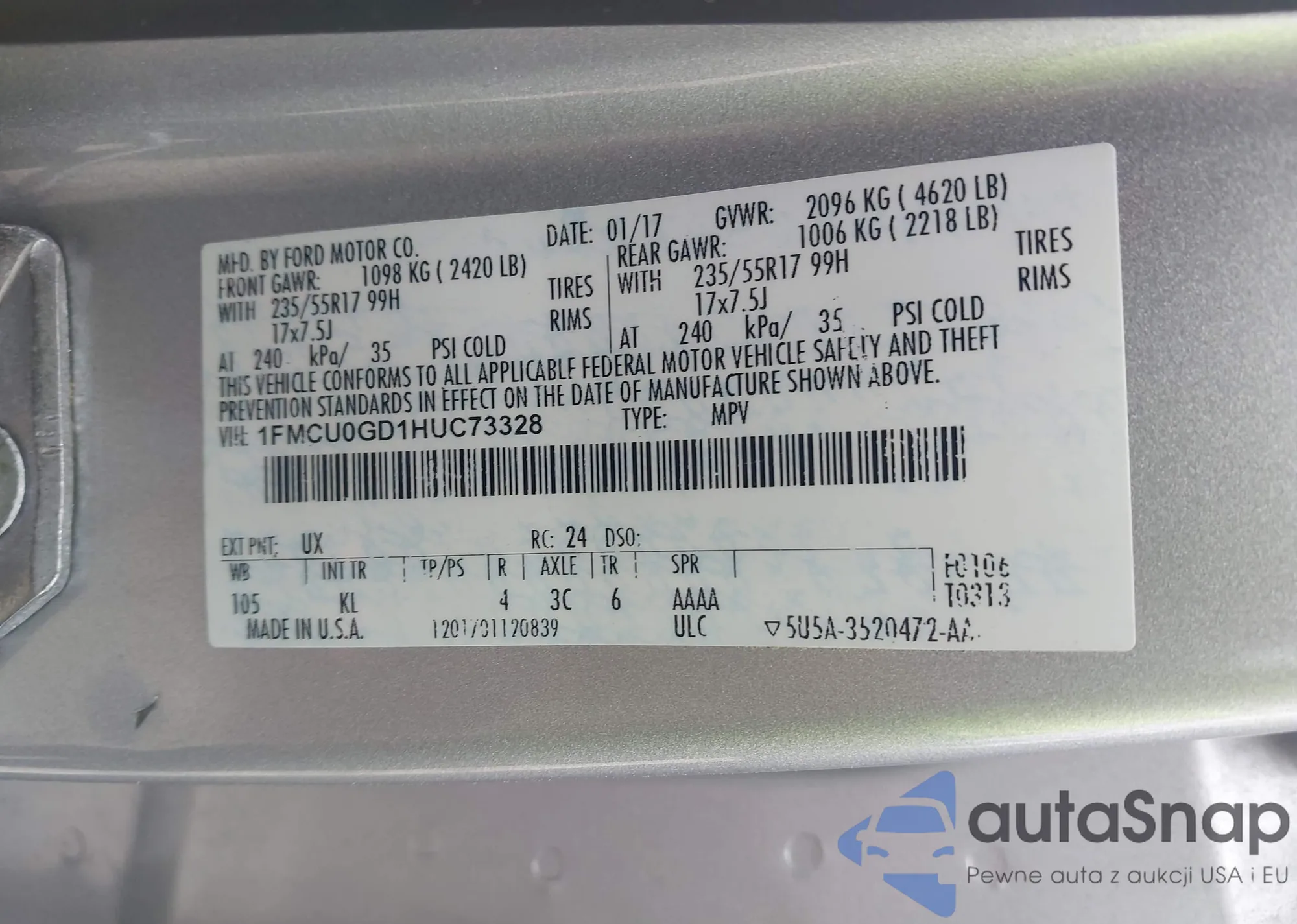 LOT: 41939422 VIN: 1FMCU0GD1HUC73328