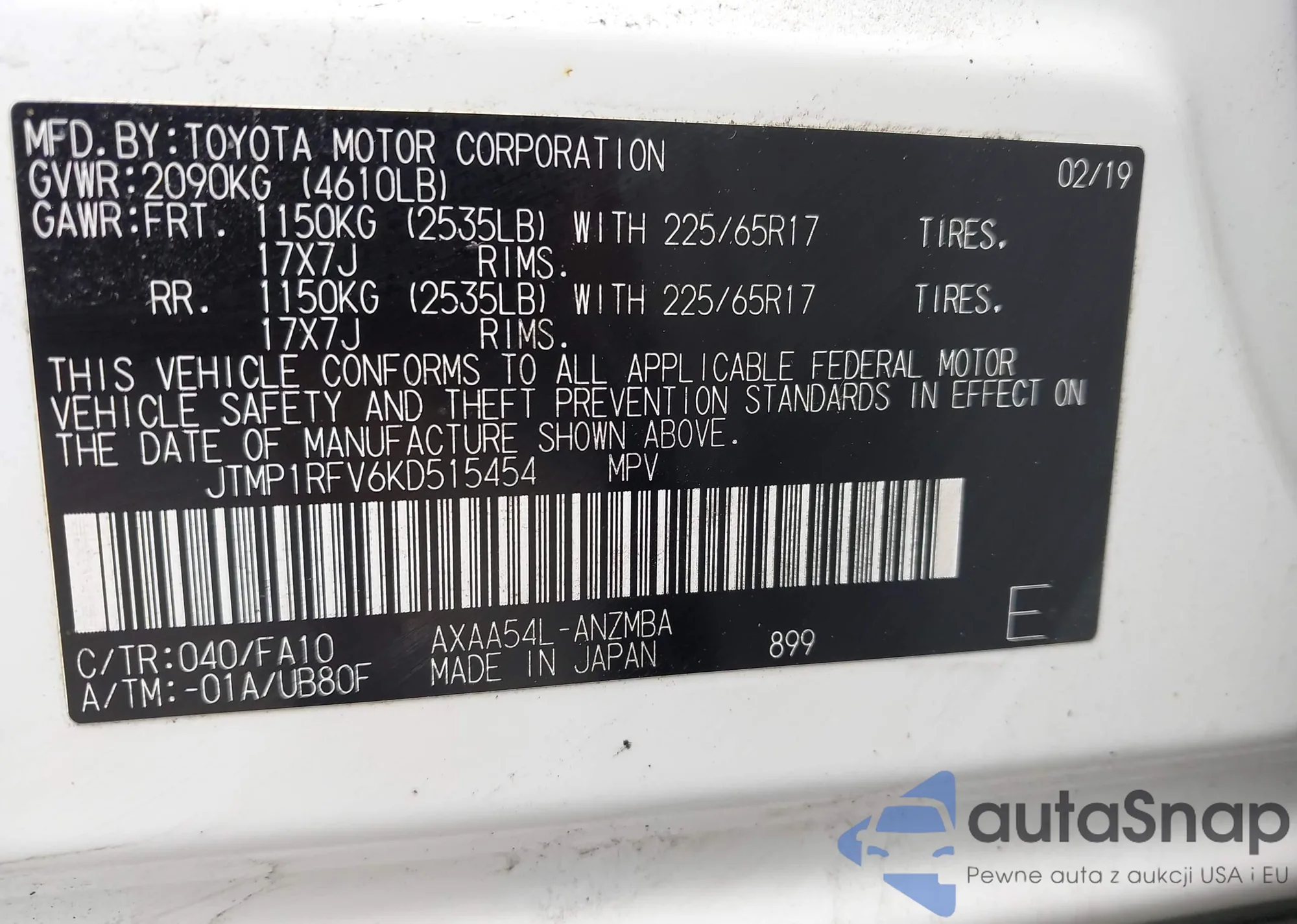 • VIN JTMP1RFV6KD515454