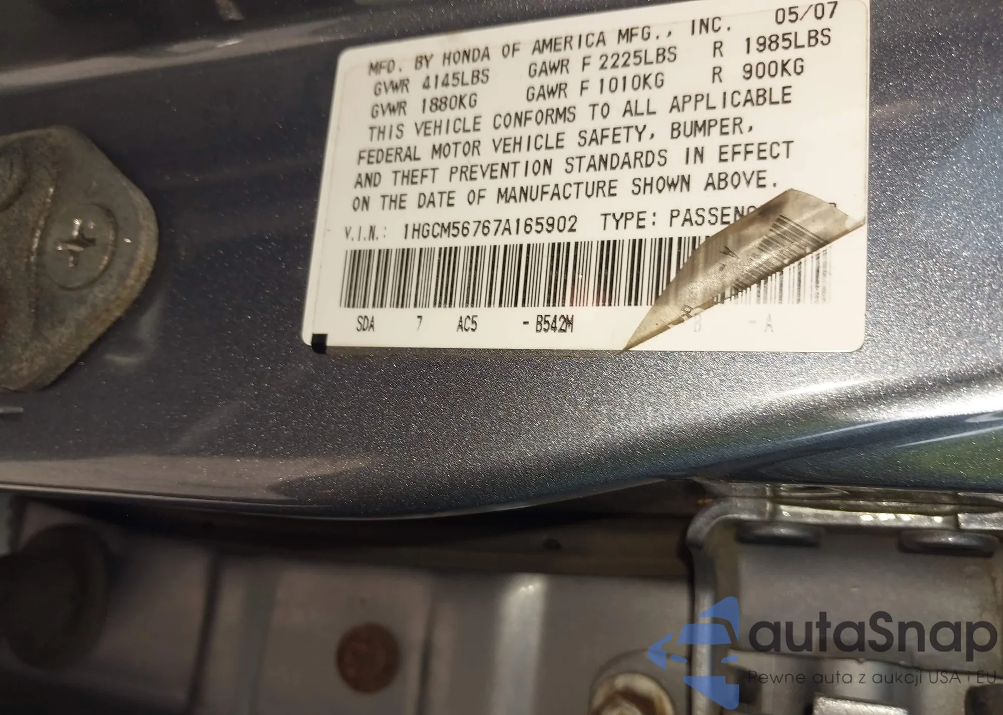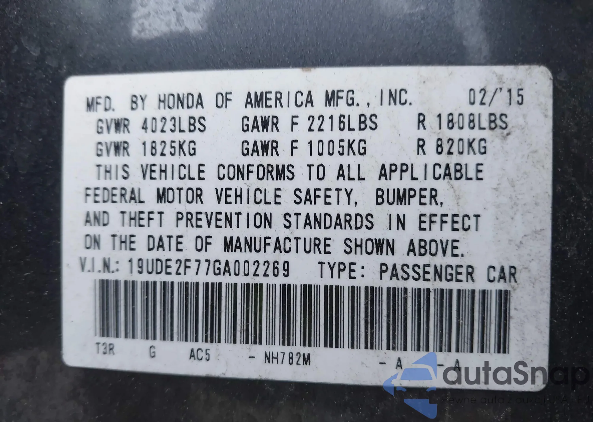 • VIN 2HKRM3H39DH517432