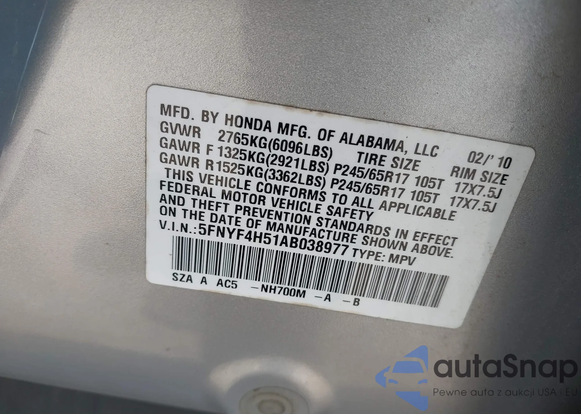 LOT: 42540439 VIN: 5FNYF4H51AB038977