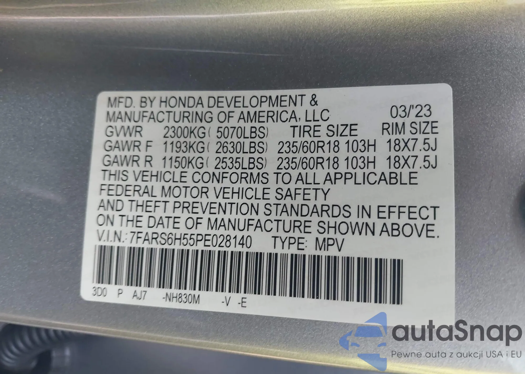 LOT: 42556517 VIN: 7FARS6H55PE028140