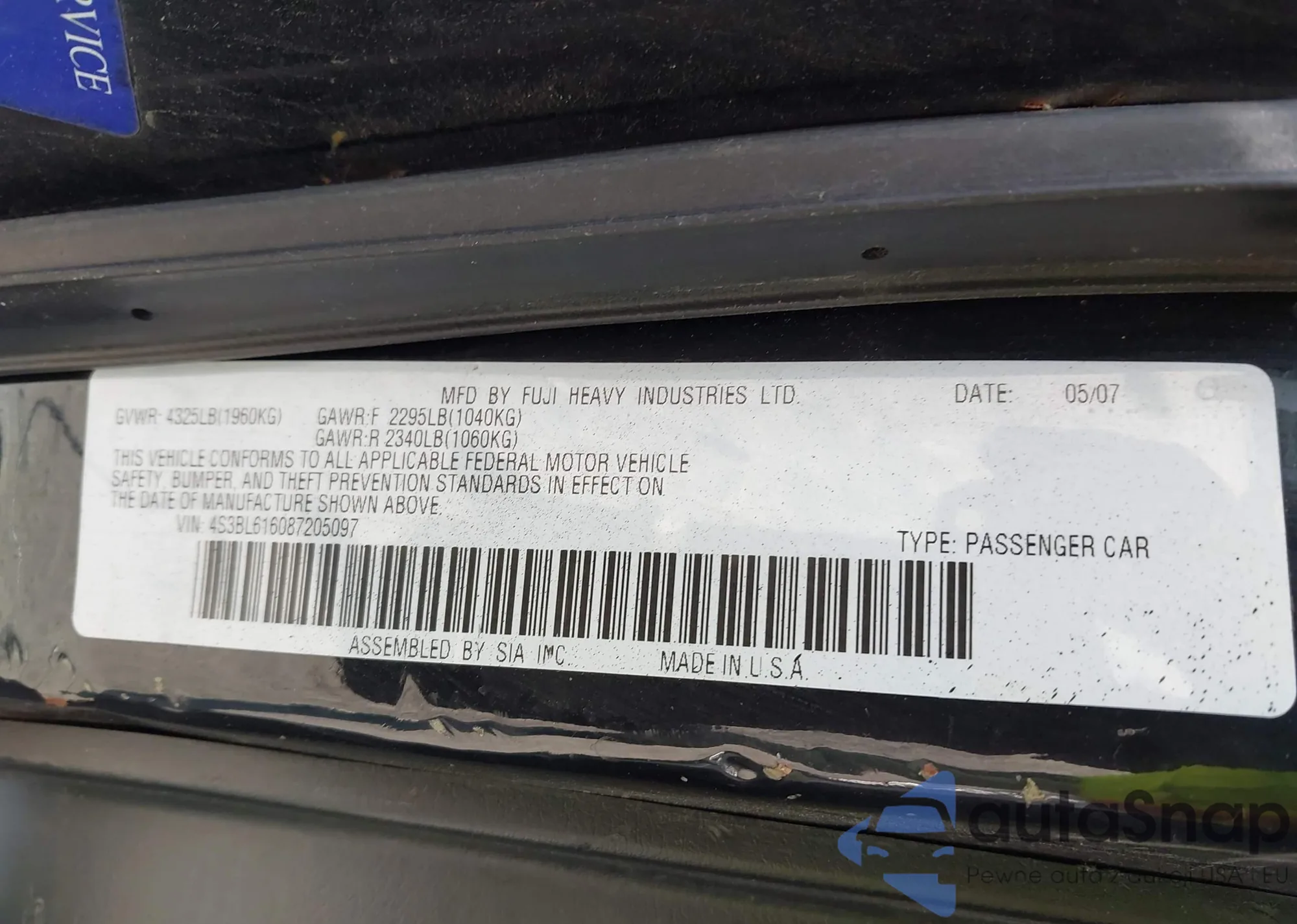 • VIN 4S3BL616087205097