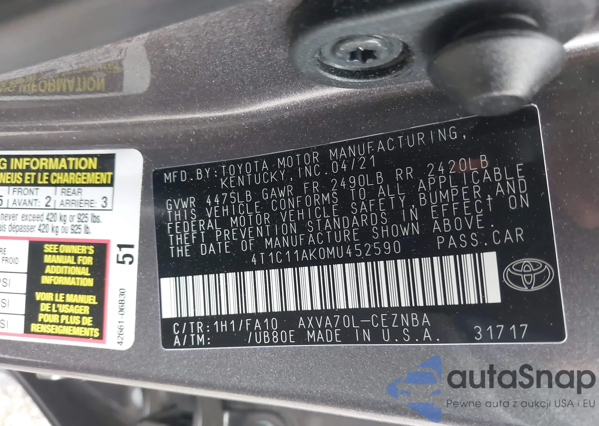• VIN 4T1C11AK0MU452590