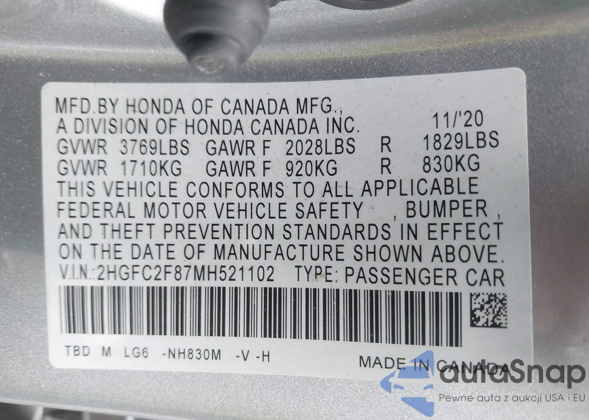 LOT: 42343733 VIN: 2HGFC2F87MH521102