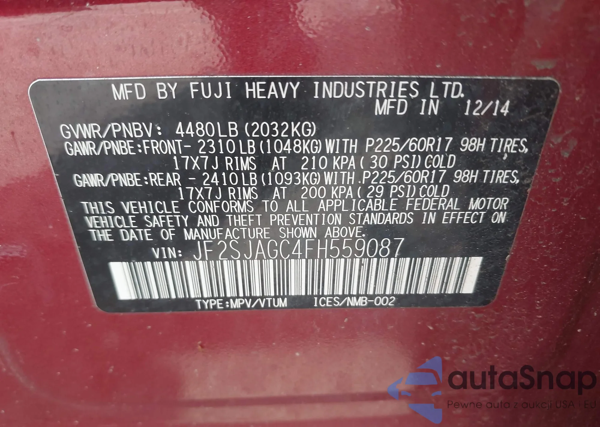 • VIN JF2SJAGC4FH559087
