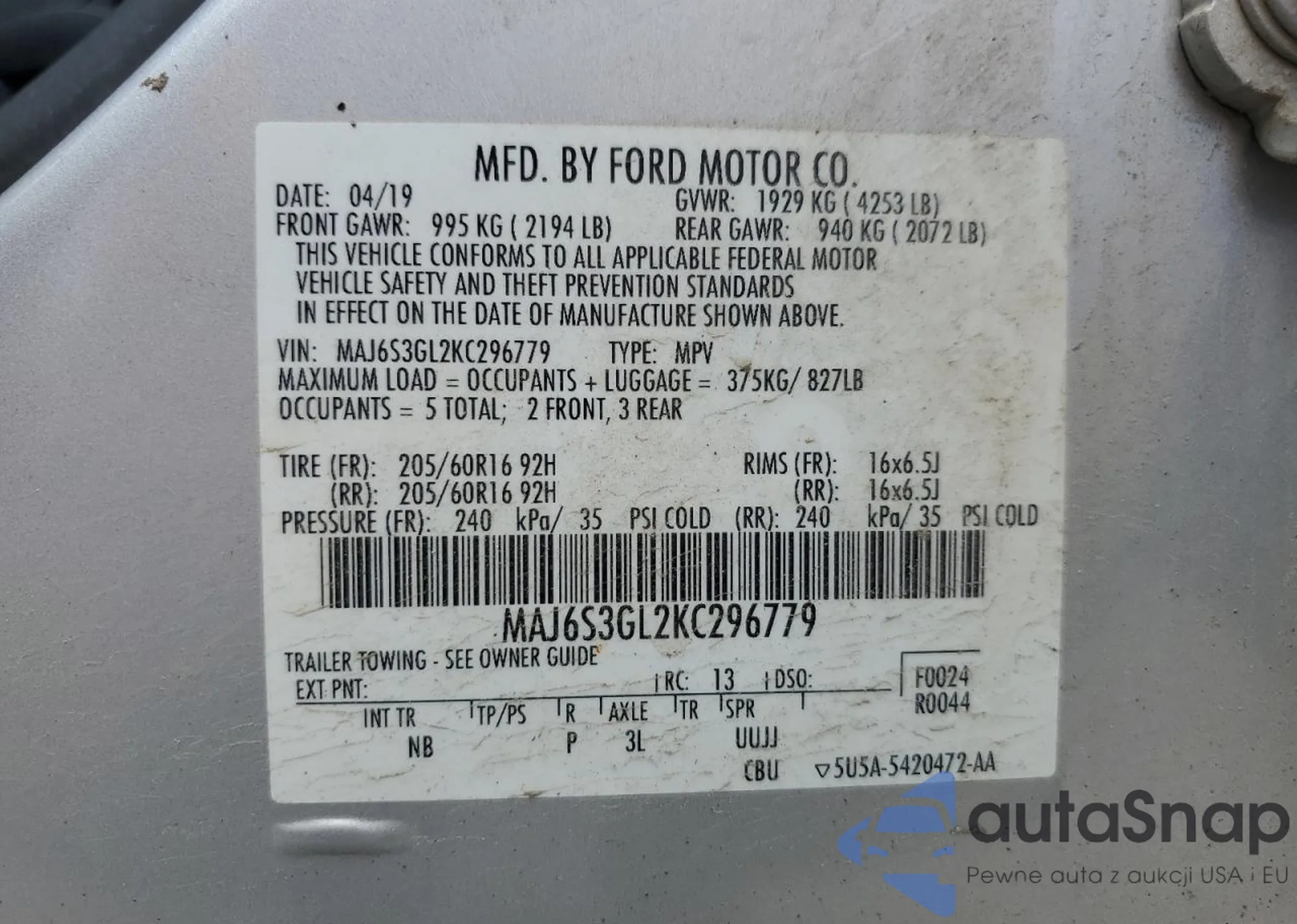 • VIN MAJ6S3GL2KC296779