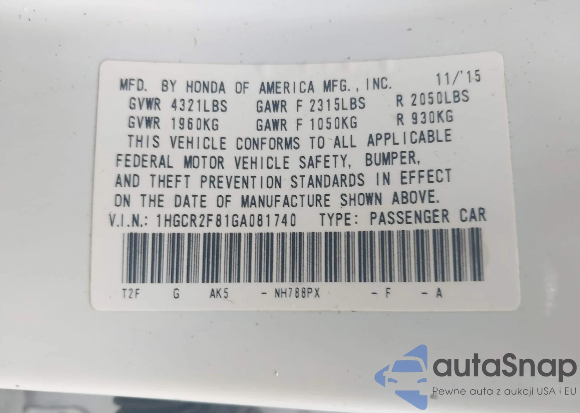 LOT: 42660056 VIN: 1HGCR2F81GA081740