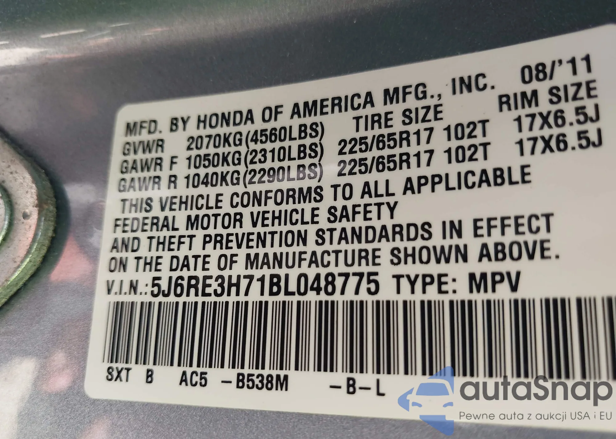 • VIN 5J6RE3H71BL048775