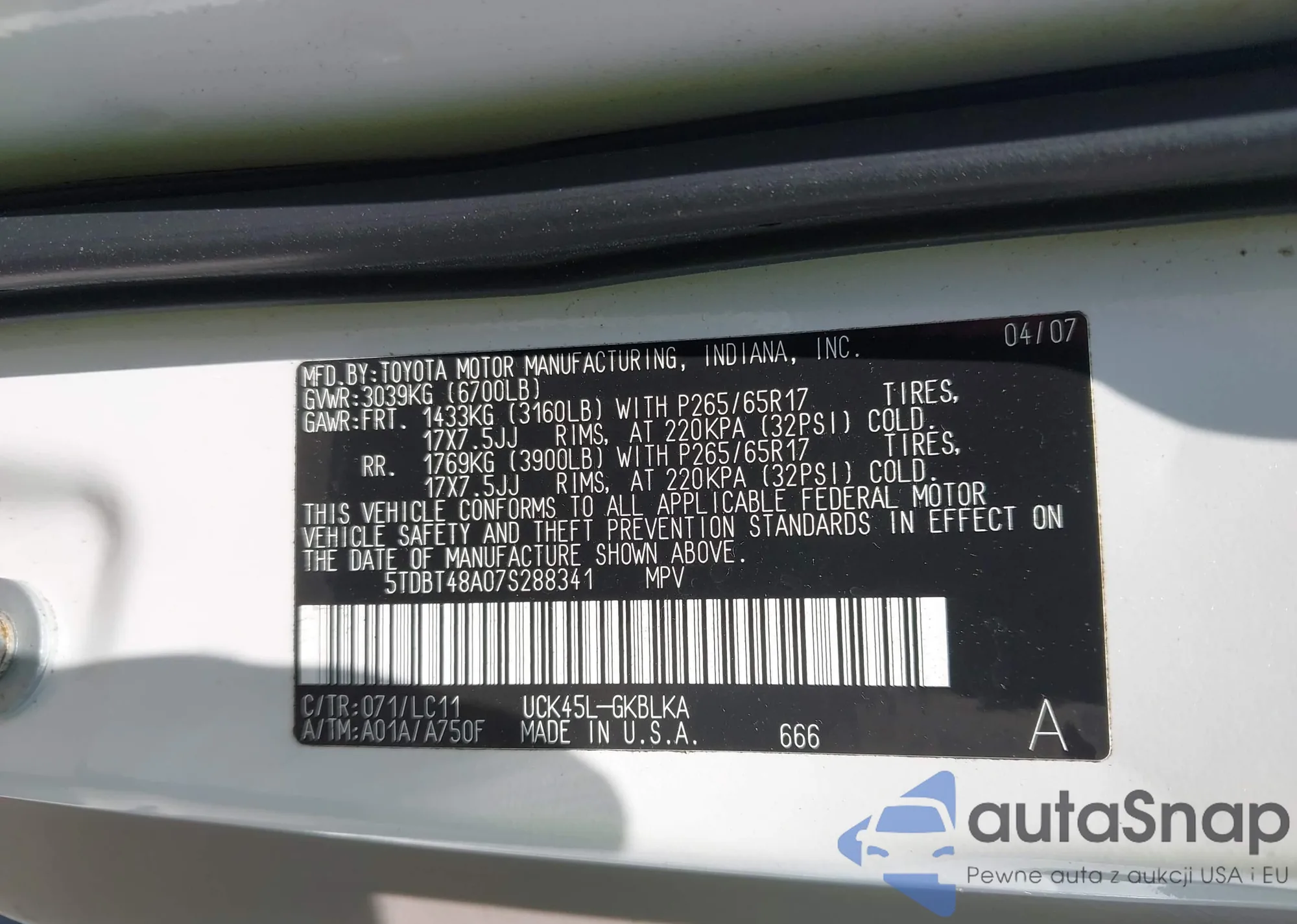 LOT: 42826671 VIN: 5TDBT48A07S288341