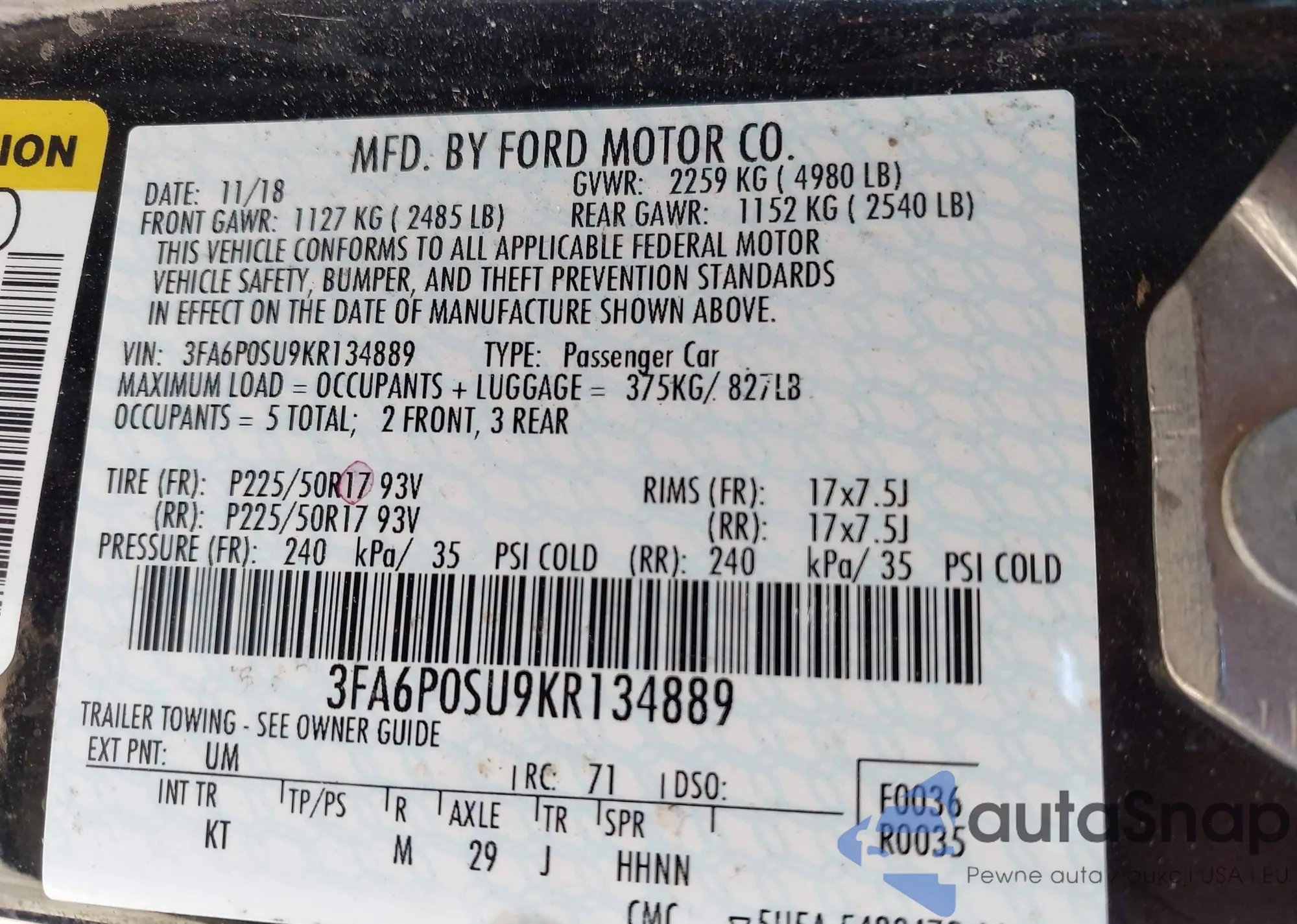• VIN 3FA6P0SU9KR134889
