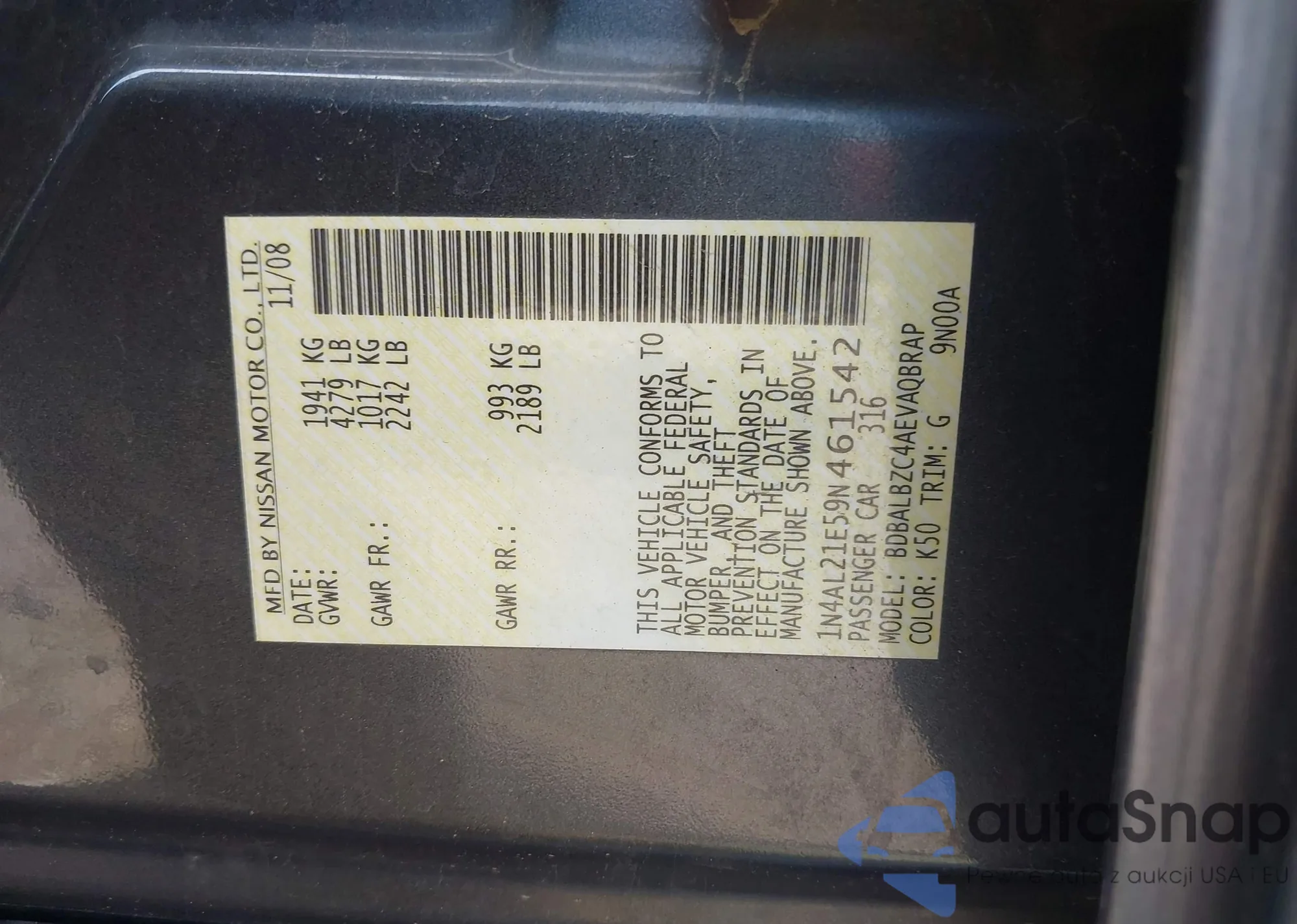 LOT: 42805332 VIN: 1N4AL21E59N461542