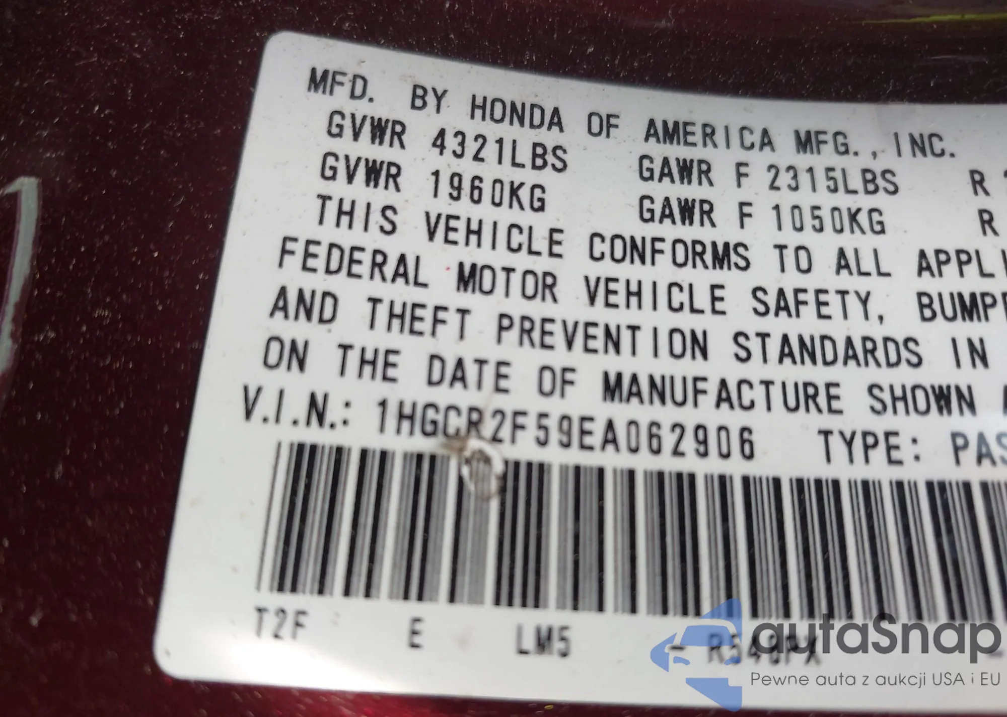 • VIN 1HGCR2F59EA062906