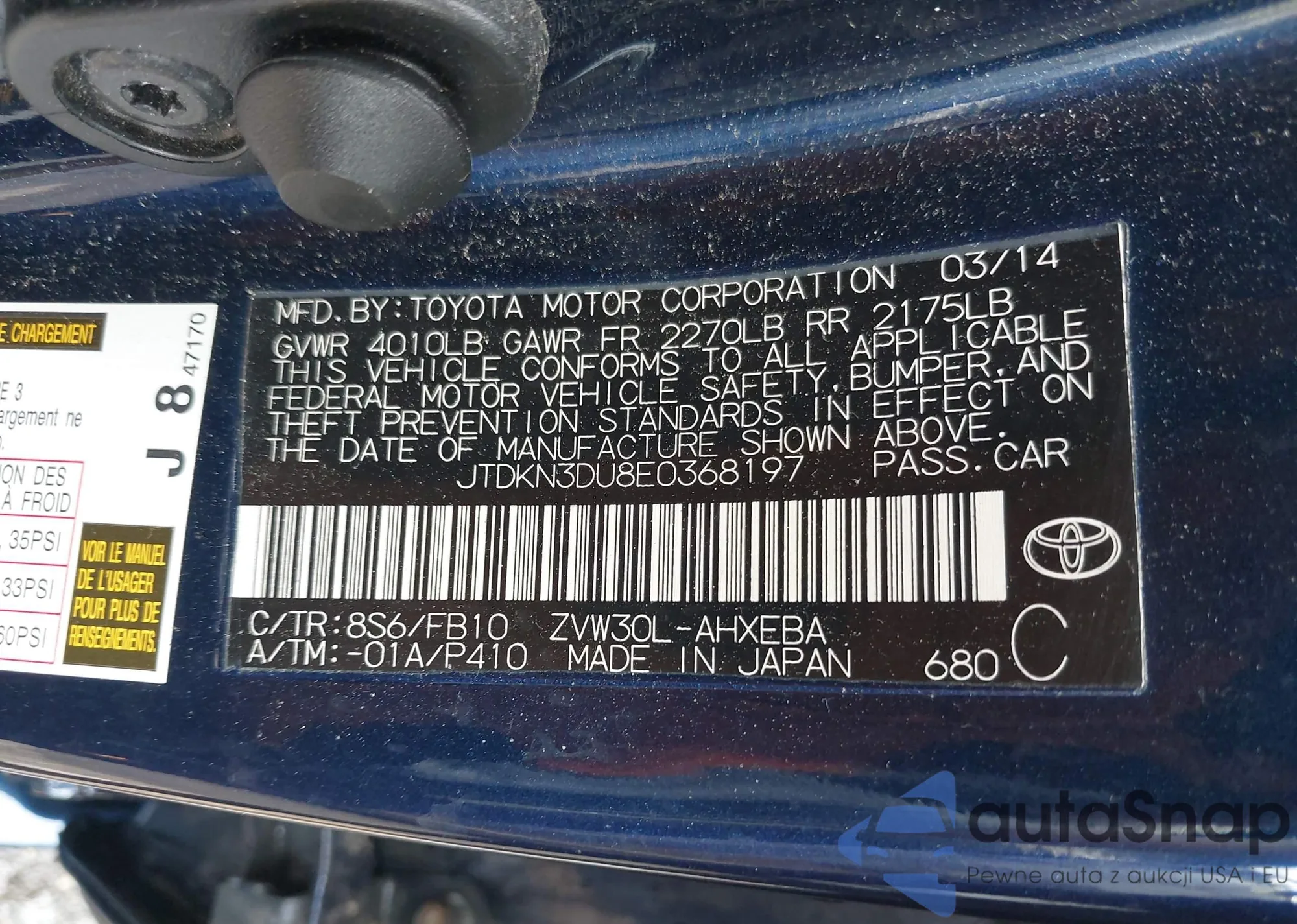 LOT: 42722019 VIN: JTDKN3DU8E0368197