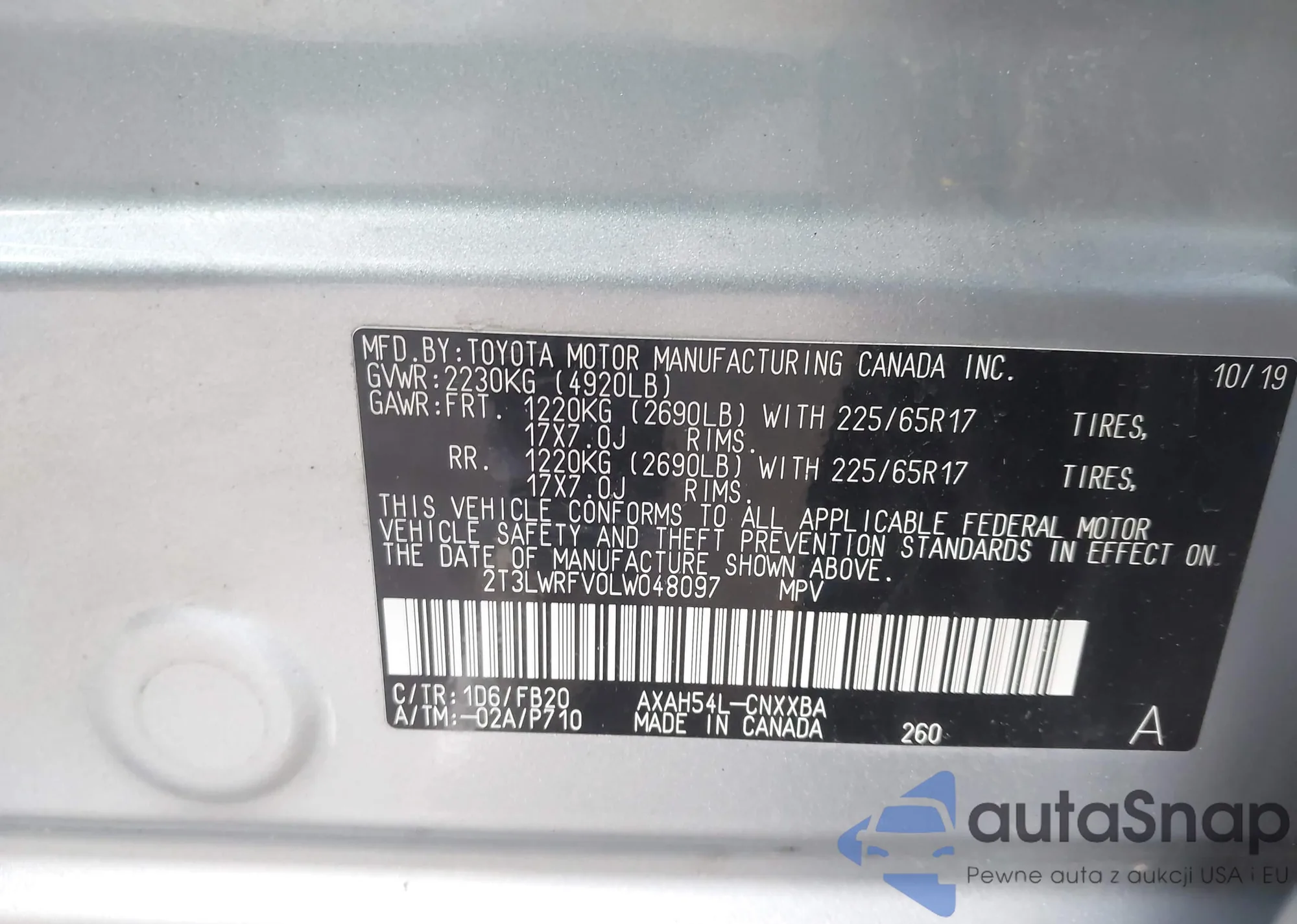 LOT: 42740238 VIN: 2T3LWRFV0LW048097