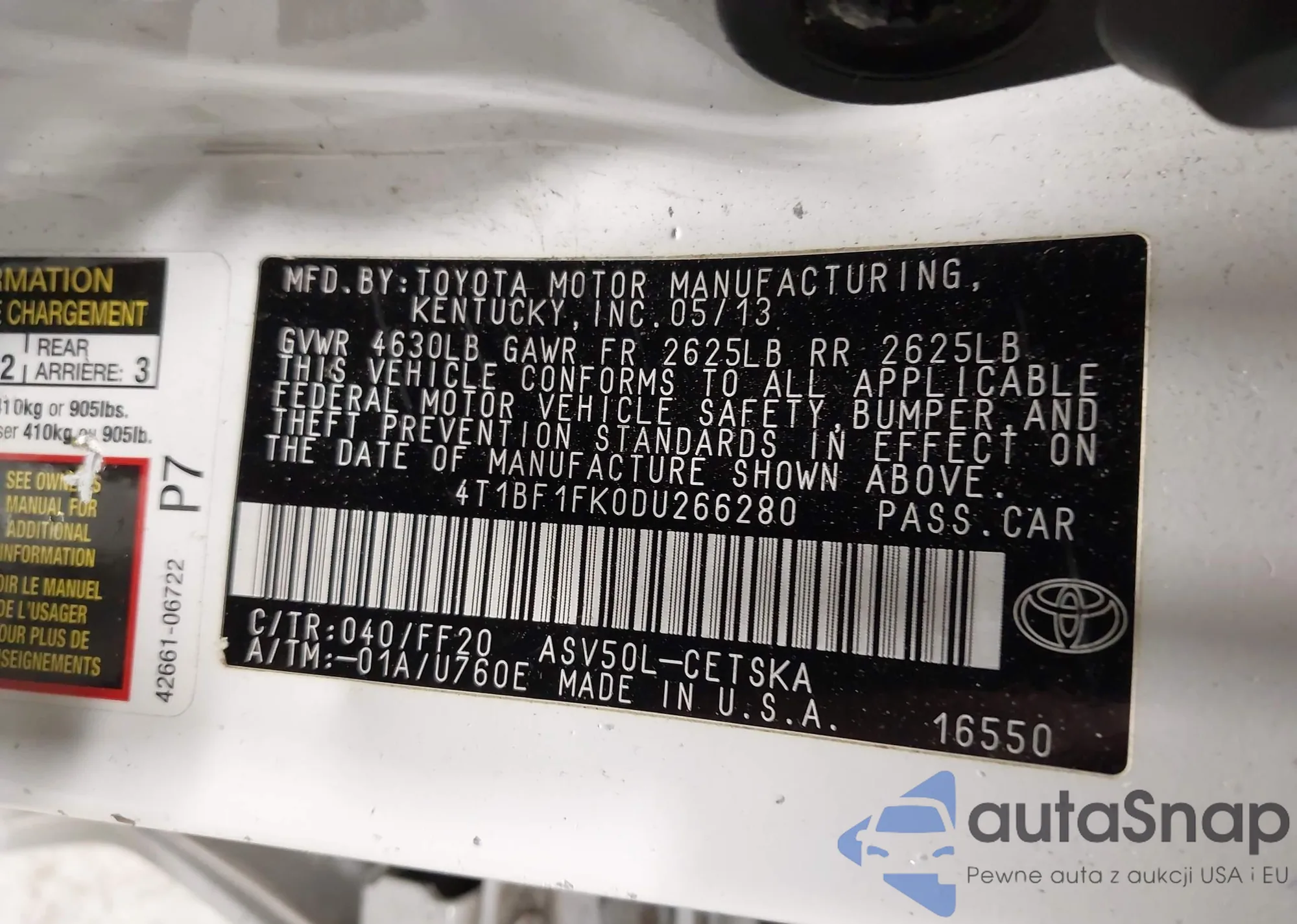 LOT: 42253333 VIN: 4T1BF1FK0DU266280