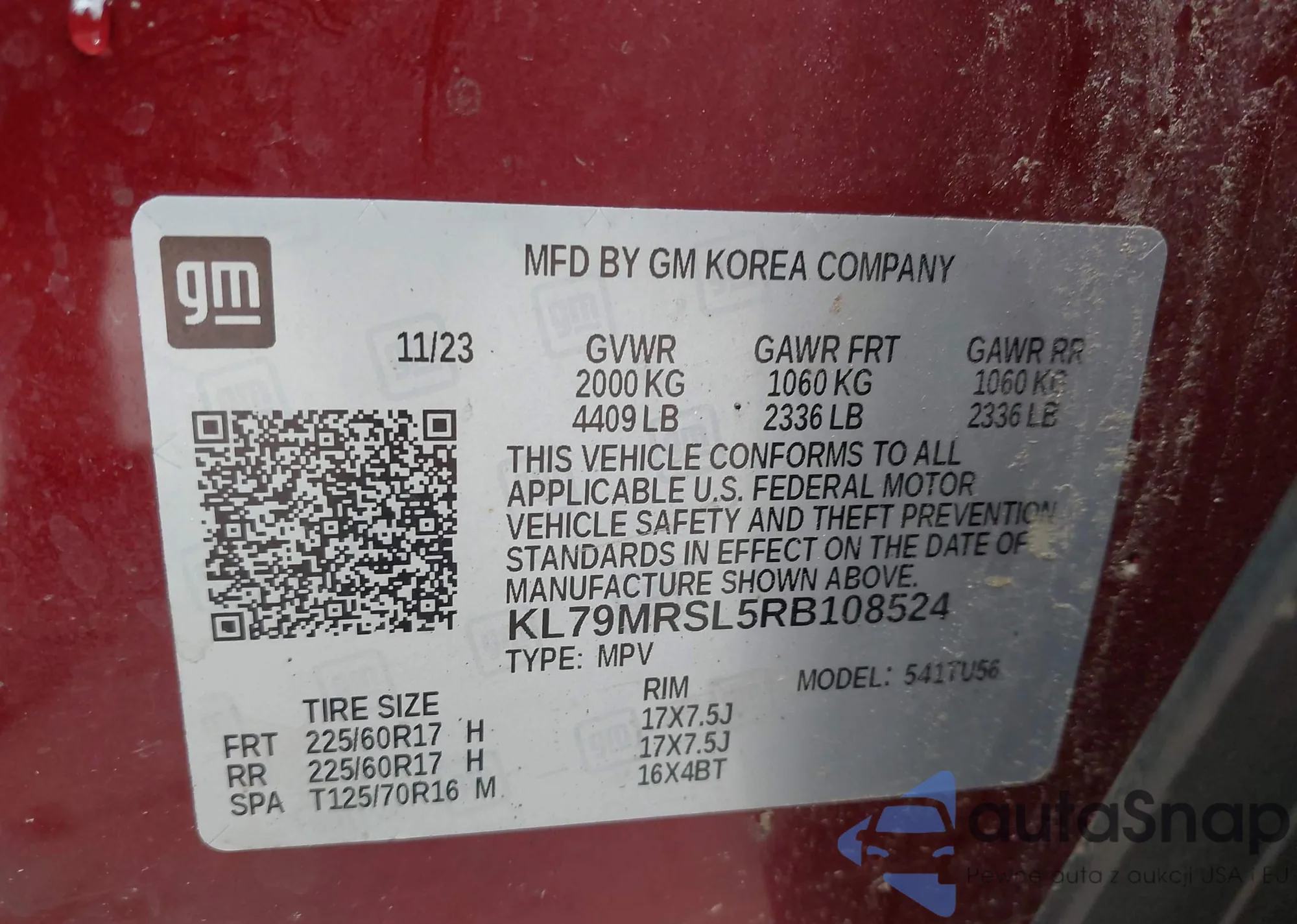 • VIN KL79MRSL5RB108524