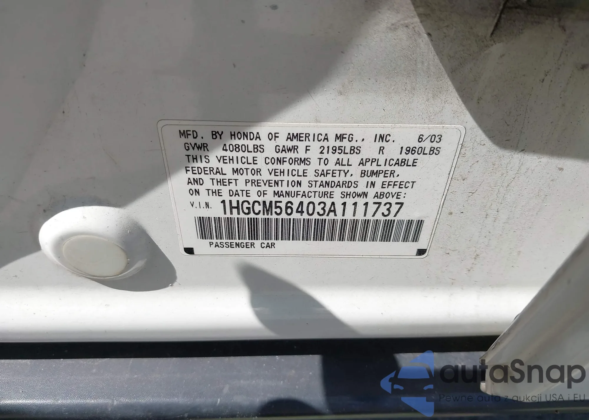 LOT: 42627361 VIN: 1HGCM56403A111737