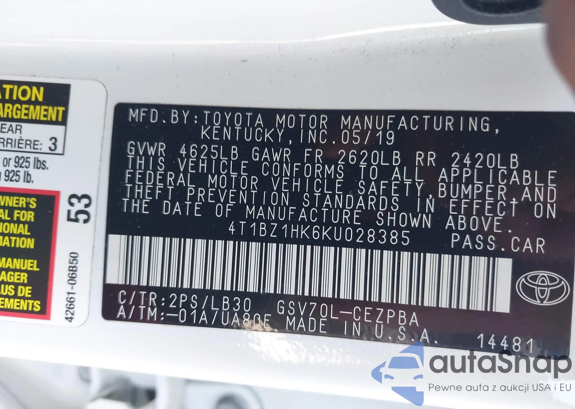 • VIN 4T1BZ1HK6KU028385